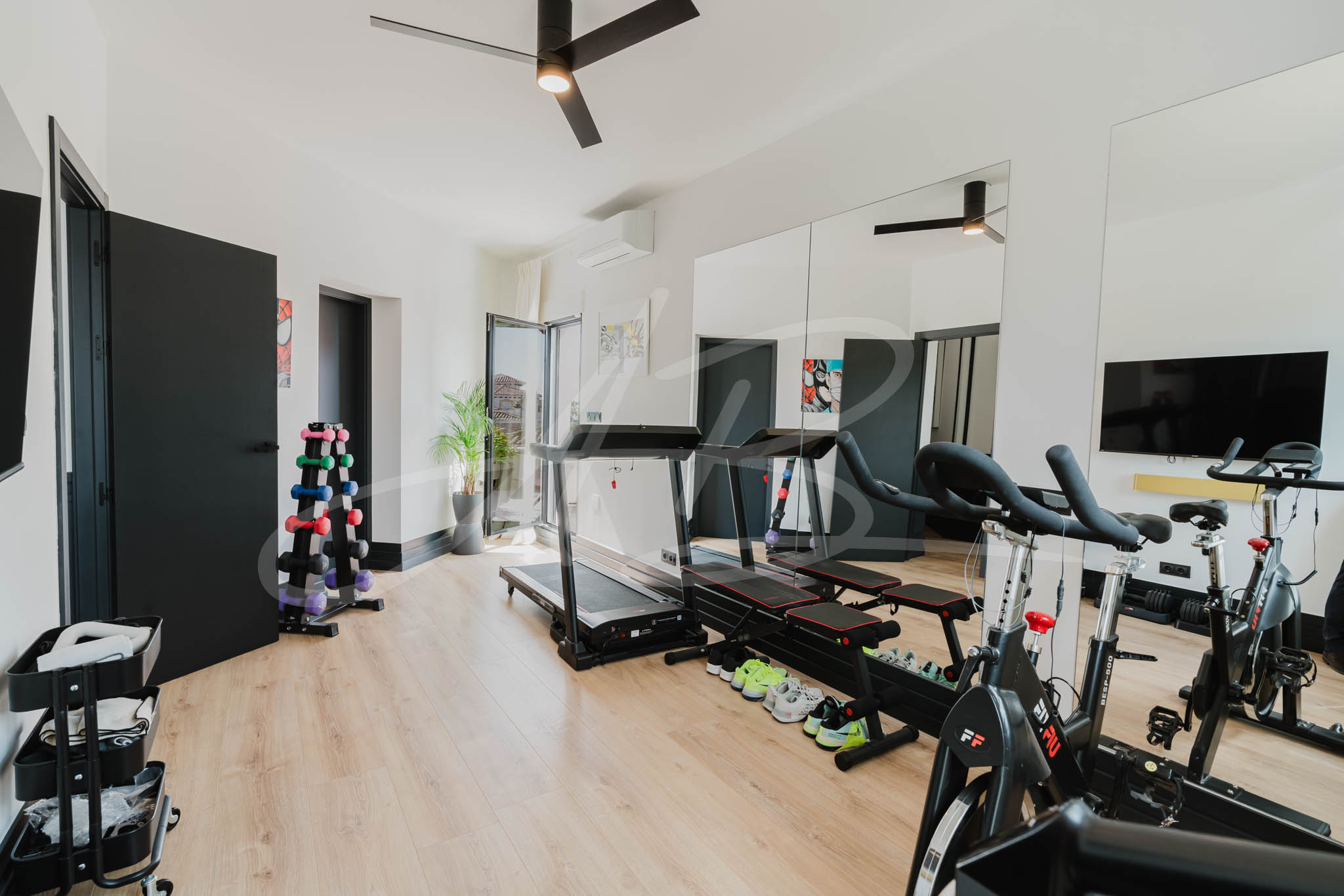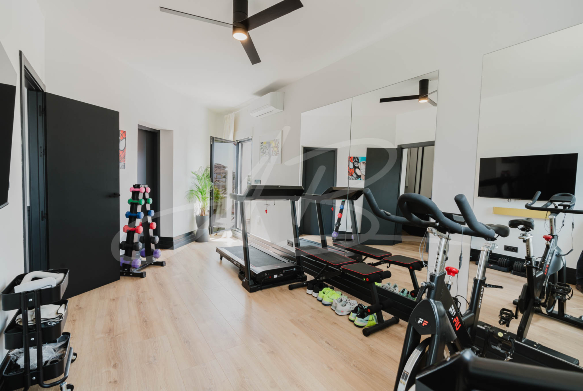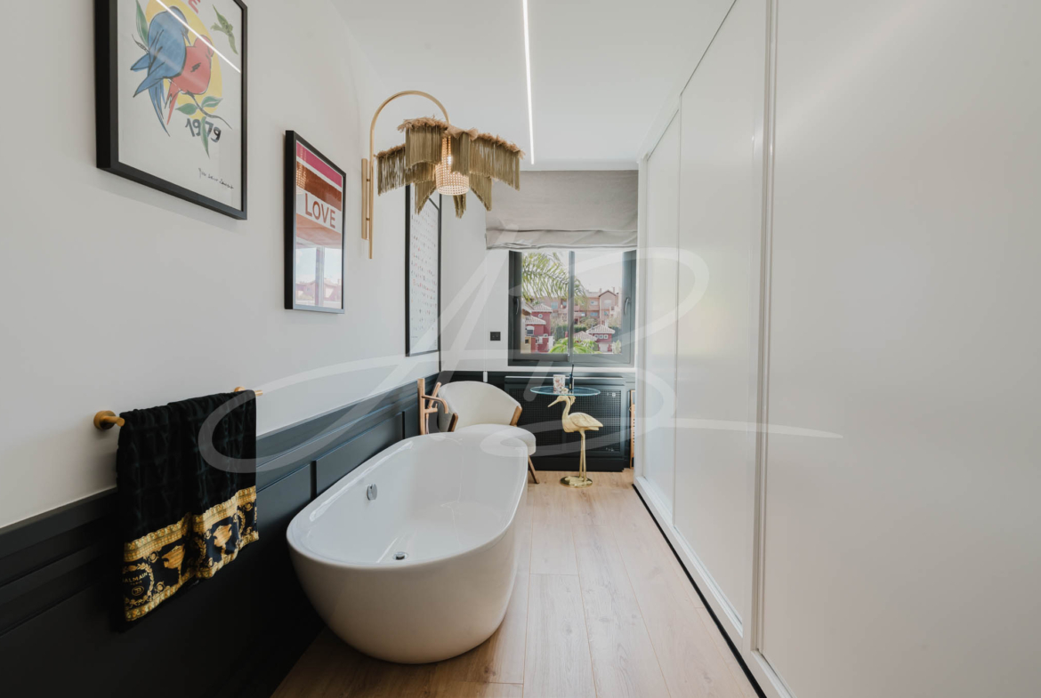 Up the glamorous staircase, another world awaits. The wallpapered tower space reaches the full height of the property and creates a talking point in itself. Painted in dark hues, the landing area leads into a fully equipped gymnasium (or the second of the two double bedrooms), a shared yet stunning bathroom, with the third bedroom and terrace beyond that. The master suite must be seen in order for it to be fully appreciated in both its size and decor, with its classy en-suite bathroom and incredible walk-in wardrobe – along with slipper bath – which would give any world class, five star hotel a run for its money and enjoys both forward and rear aspects….and a private terrace.