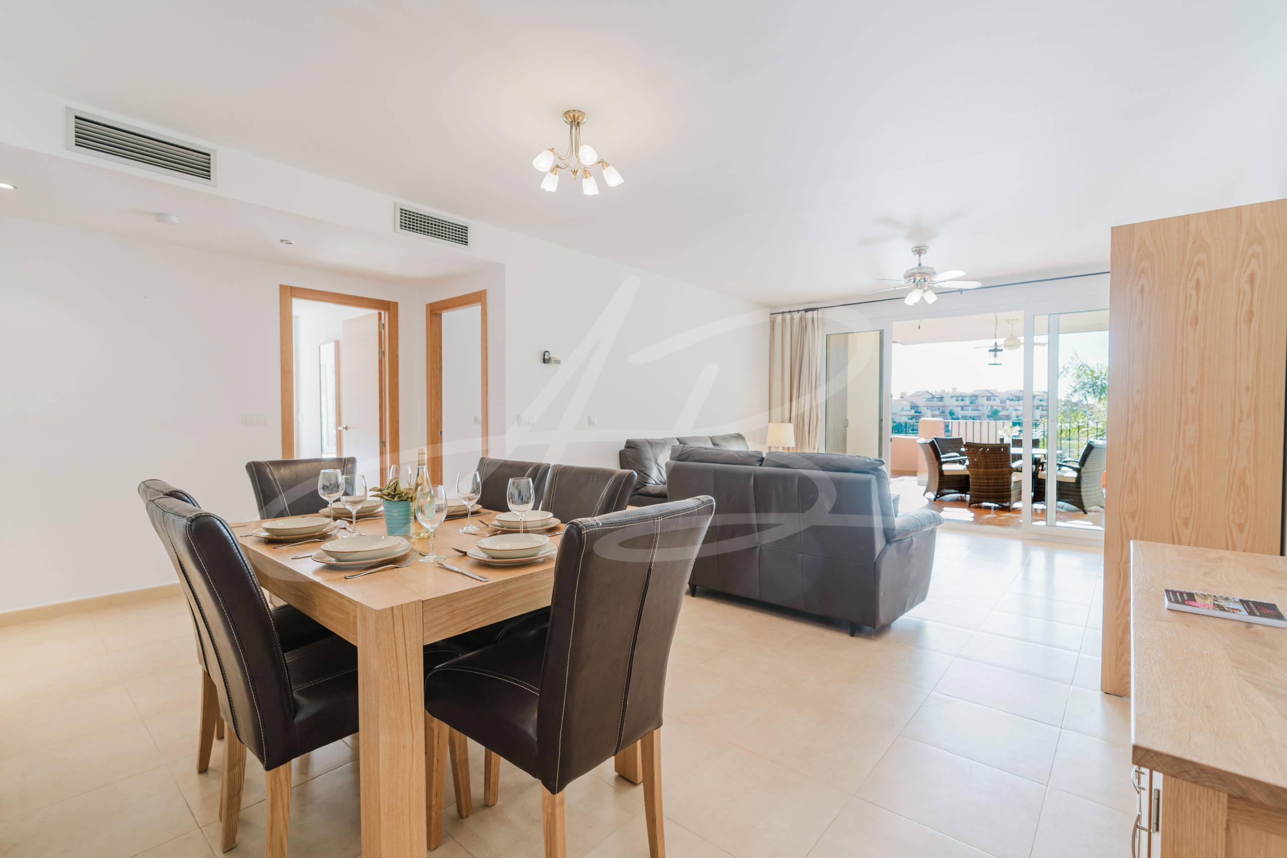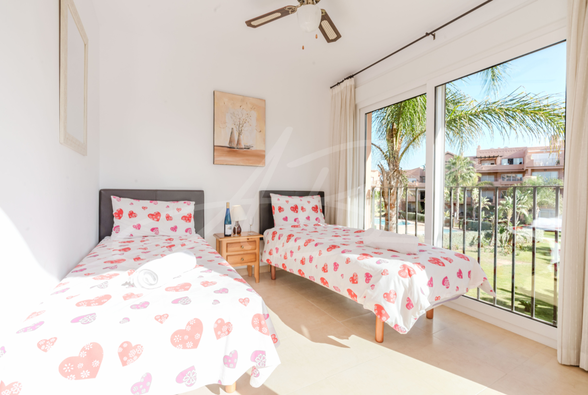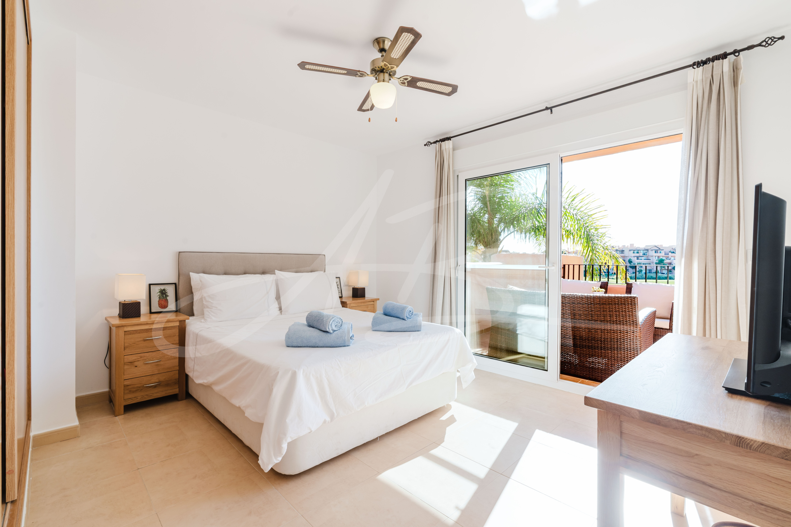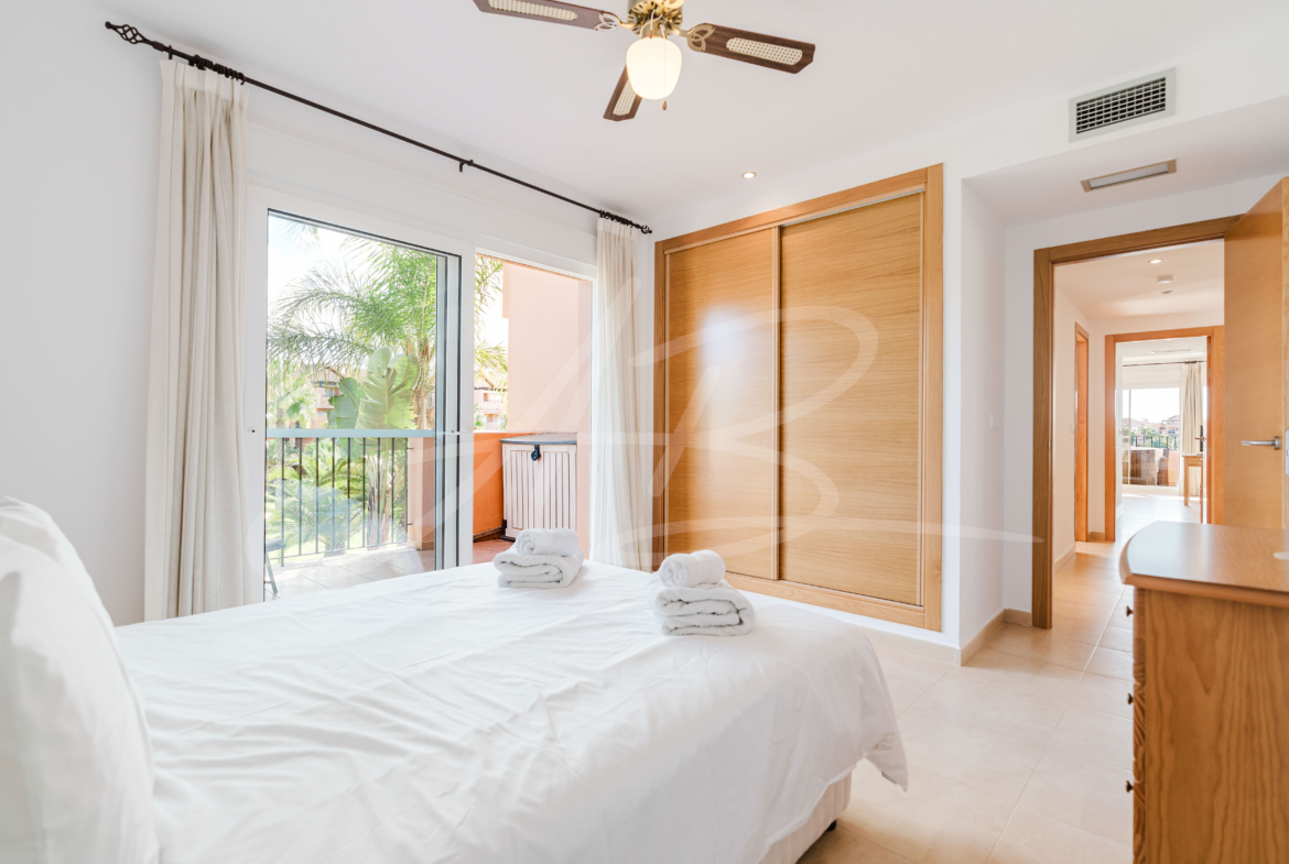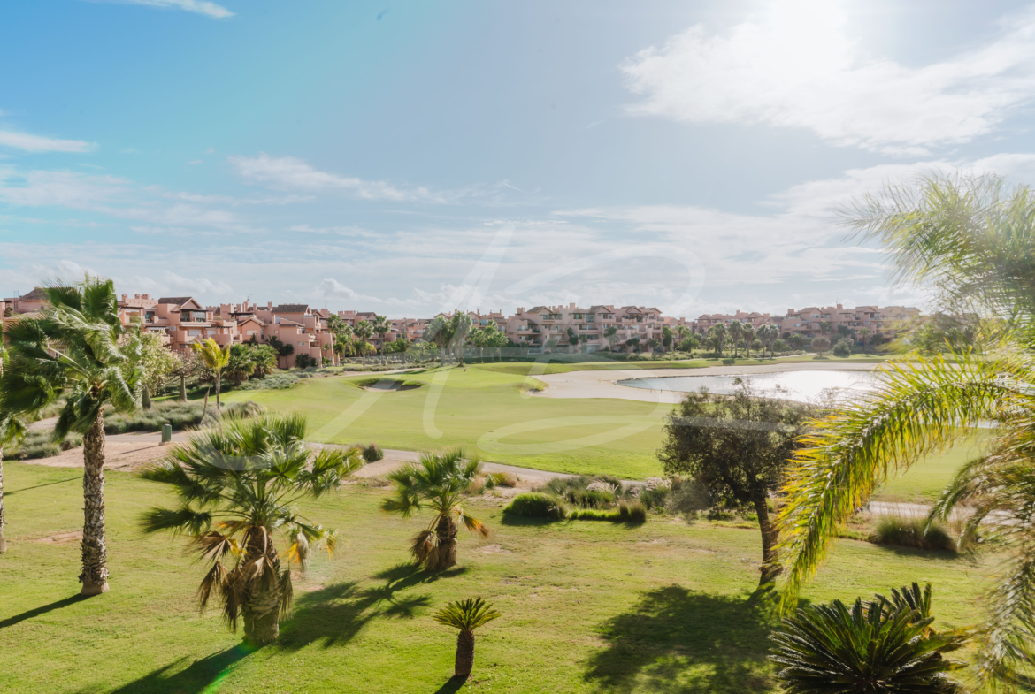 A stunning three bedroom, two bath apartment situated in the highly regarded Melvin Community on Mar Menor Golf Resort, combining outstanding outdoor sun terraces, stunning views, quality finishes and a premium position in the resort. Each of the three bedrooms opens directly onto its own private terrace, creating an exceptional connection between indoor and outdoor living. The main bedroom features its own ensuite bathroom and direct access — together with the lounge — to the generous main terrace, which enjoys sweeping views across the lake and the golf course. The two further bedrooms each open onto terraces overlooking the communal swimming pool, offering sun-filled, relaxing spaces in their own right.