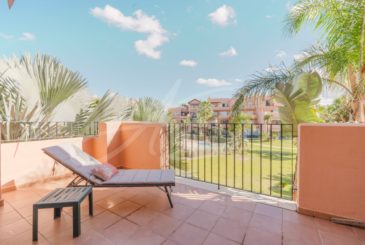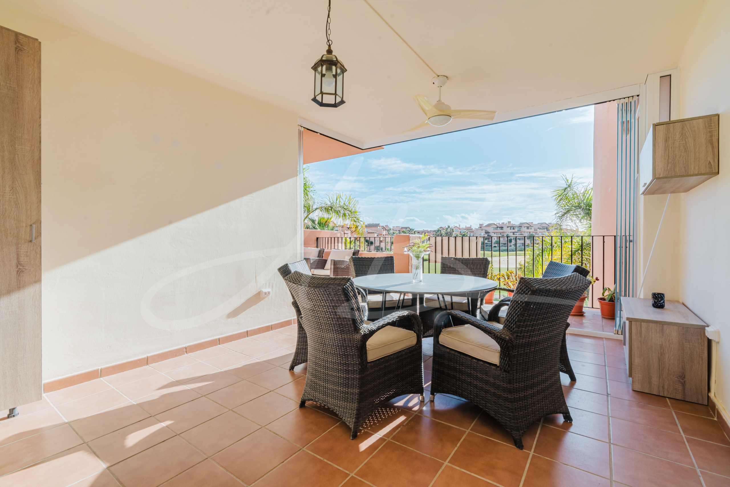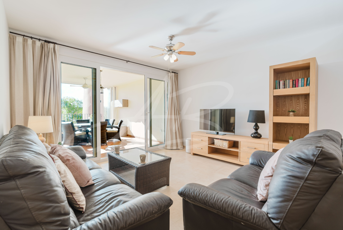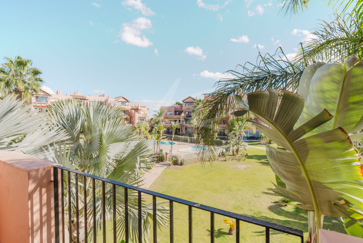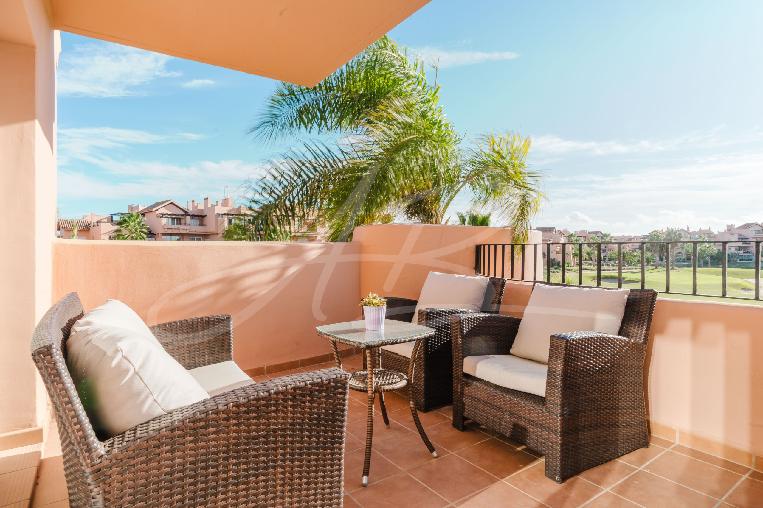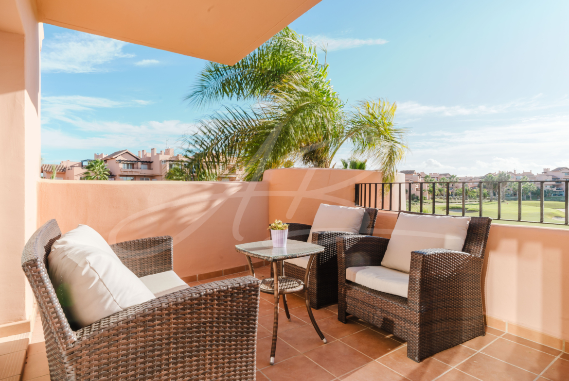 A stunning three bedroom, two bath apartment situated in the highly regarded Melvin Community on Mar Menor Golf Resort, combining outstanding outdoor sun terraces, stunning views, quality finishes and a premium position in the resort. Each of the three bedrooms opens directly onto its own private terrace, creating an exceptional connection between indoor and outdoor living. The main bedroom features its own ensuite bathroom and direct access — together with the lounge — to the generous main terrace, which enjoys sweeping views across the lake and the golf course. The two further bedrooms each open onto terraces overlooking the communal swimming pool, offering sun-filled, relaxing spaces in their own right.