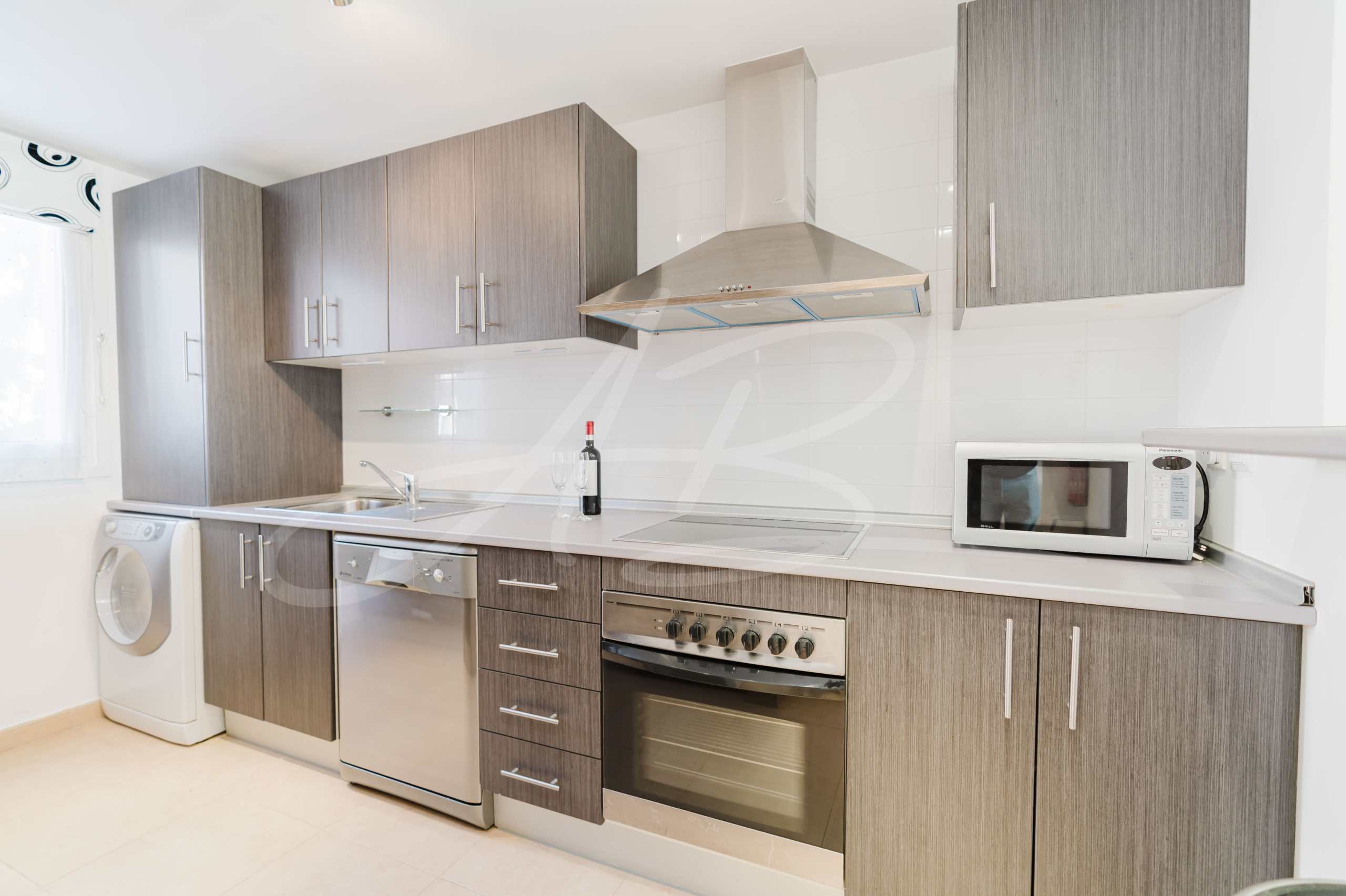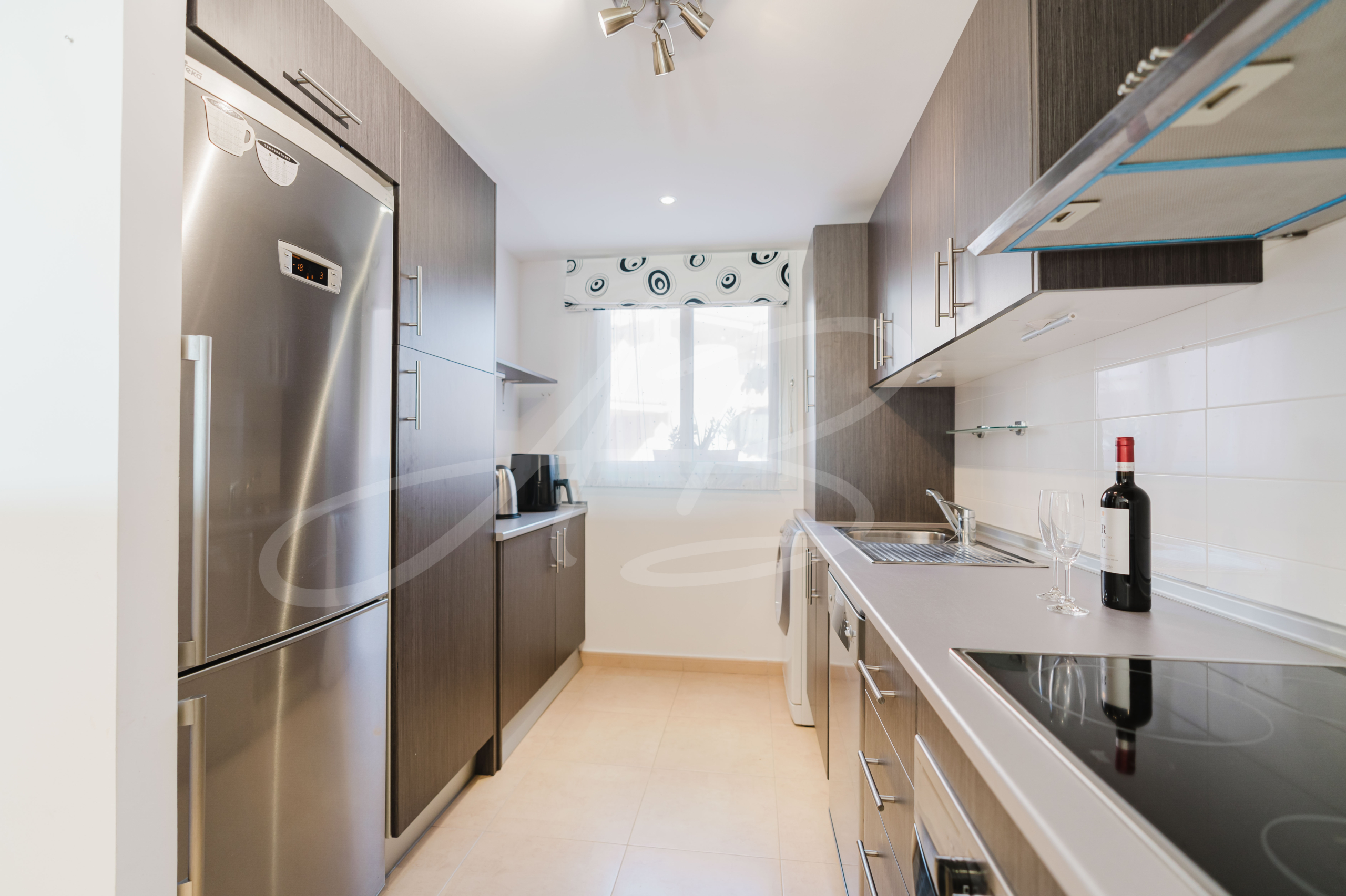The living space flows seamlessly onto the main terrace, and part of this terrace has been enclosed with glass curtains to form a flexible dining or lounge space — ideal for entertaining, al-fresco meals or relaxing while enjoying the views. The home also features a smart galley-style kitchen with breakfast bar, perfect for modern living and casual gatherings. Fully furnished, this apartment is presented for immediate enjoyment and is key ready.