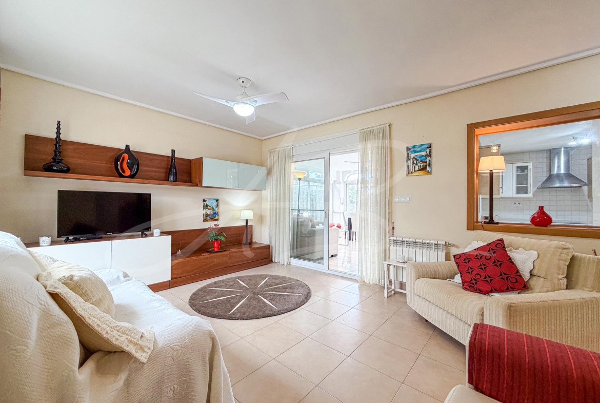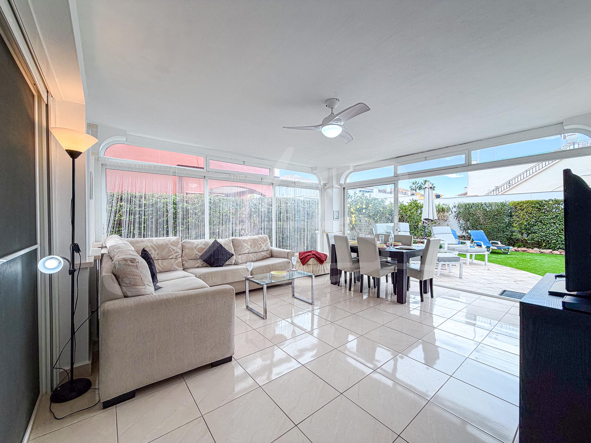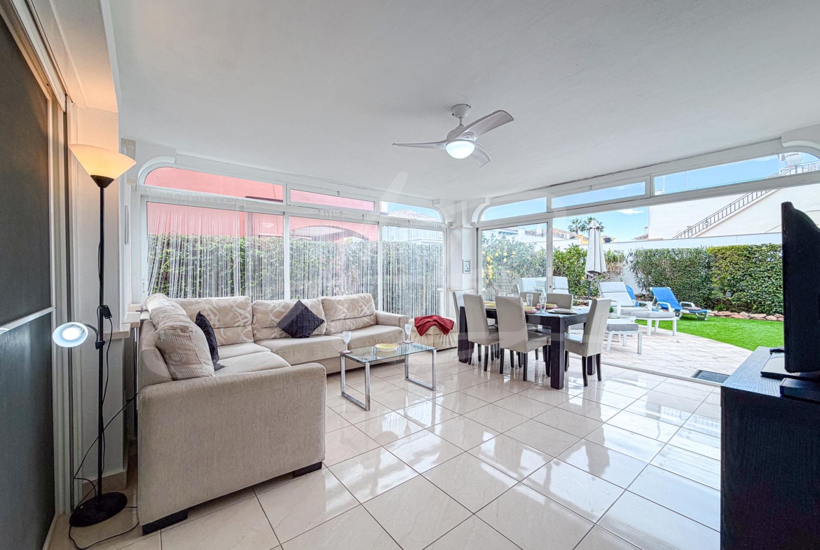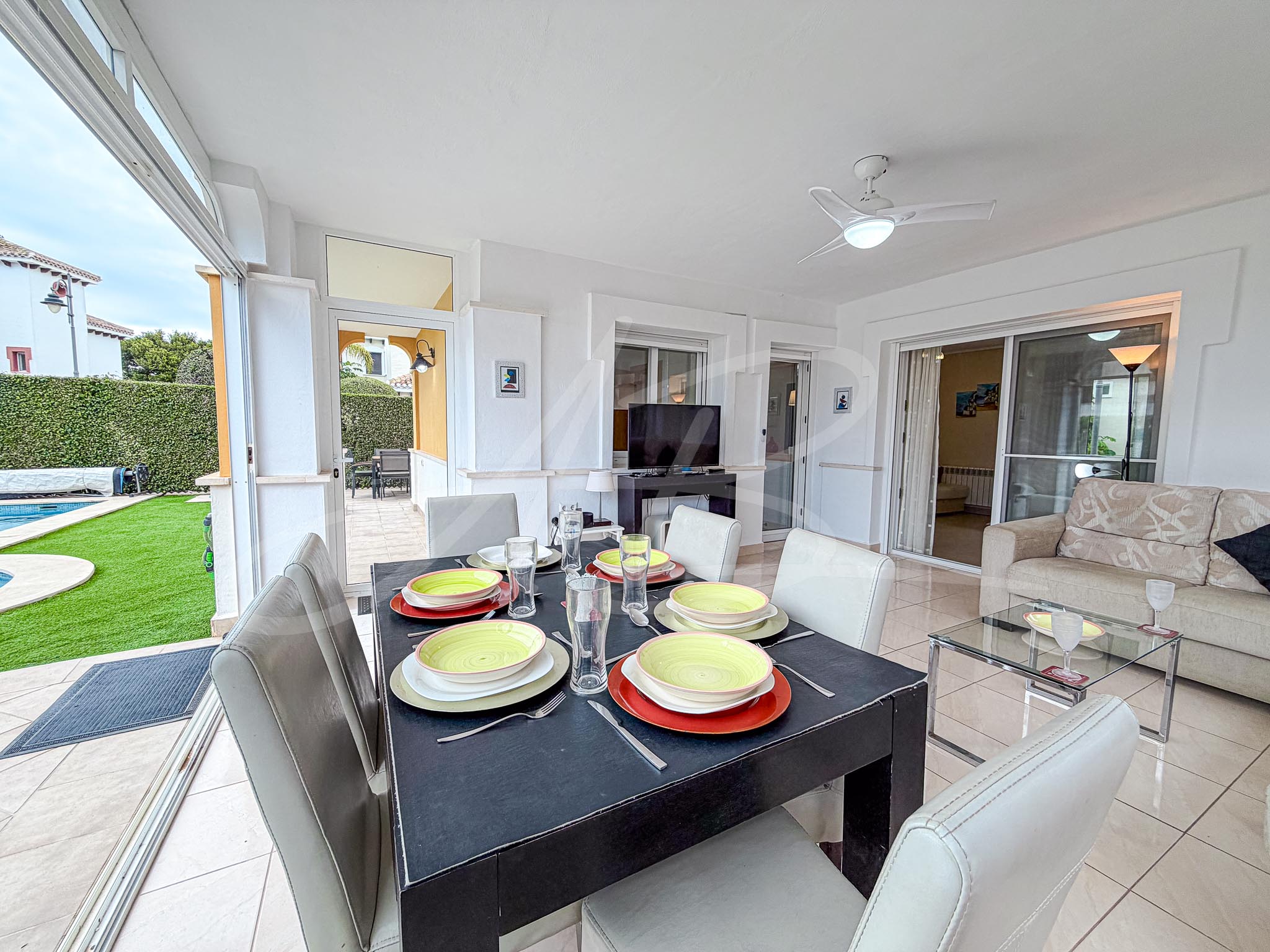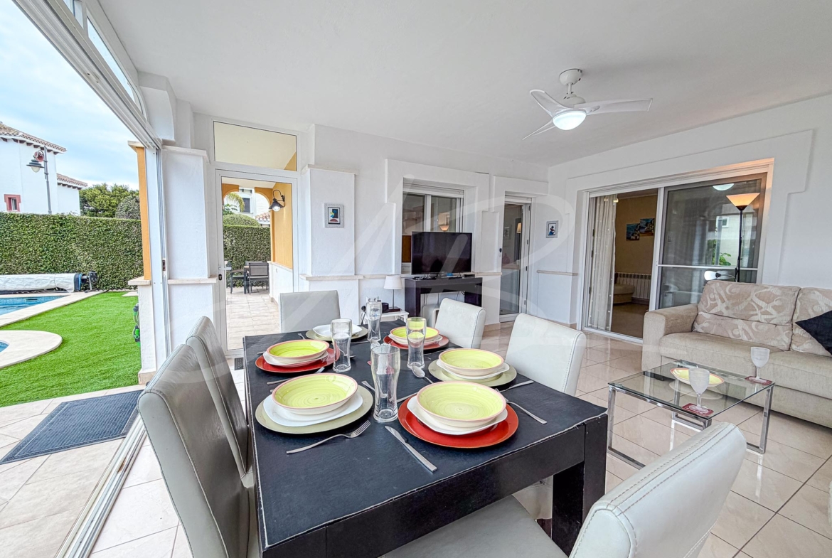 A fully glazed-in terrace has made for a perfect ‘extra’ downstairs room and is currently used as a sun lounge and dining room. When the glazing is fully opened, fabulous al-fresco living is guaranteed, and with direct access out into the part tiled/part astro-turfed garden there is so much space for entertaining and relaxation around the villa’s stunning family sized swimming pool.