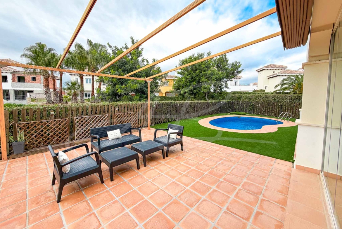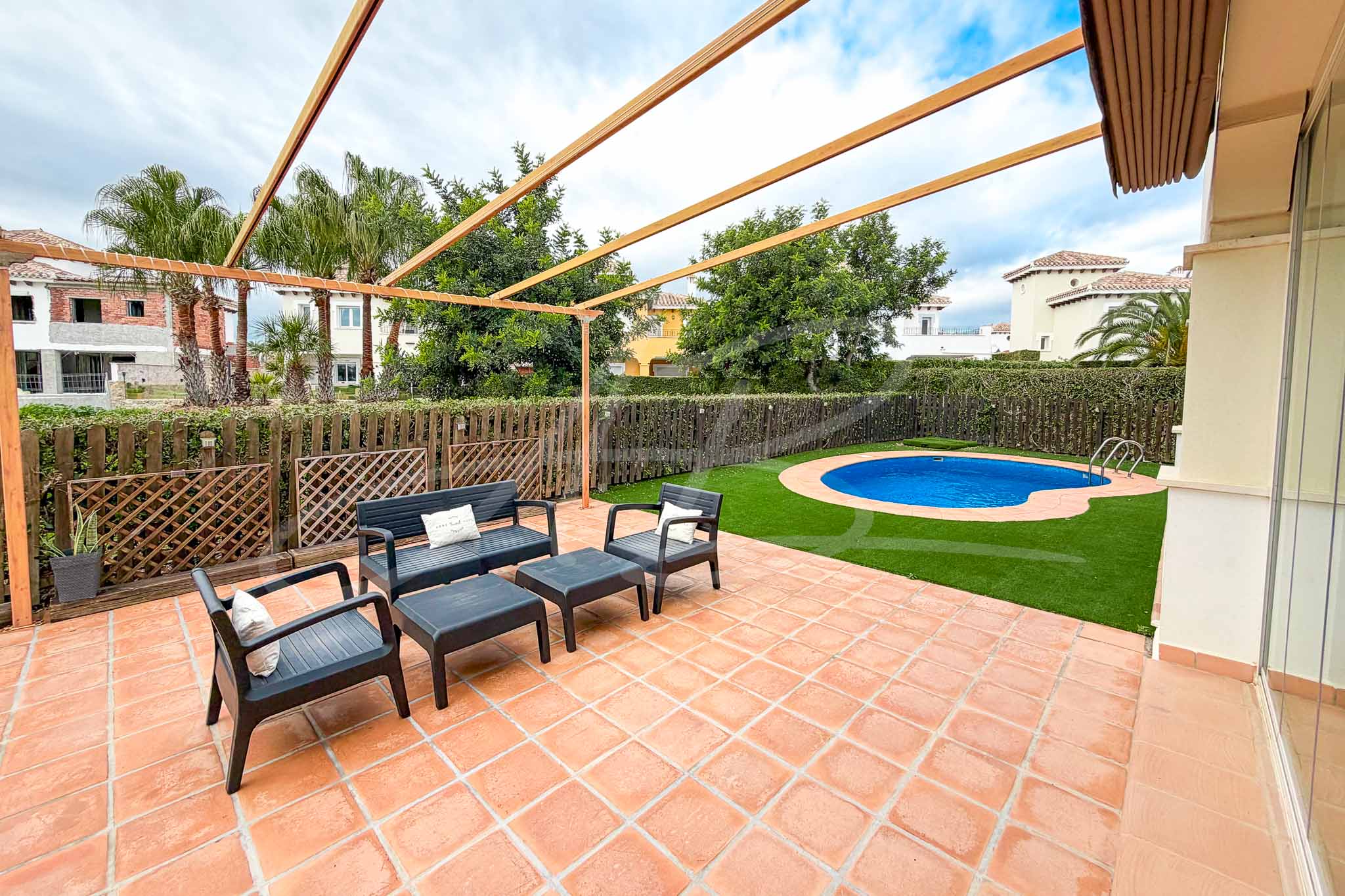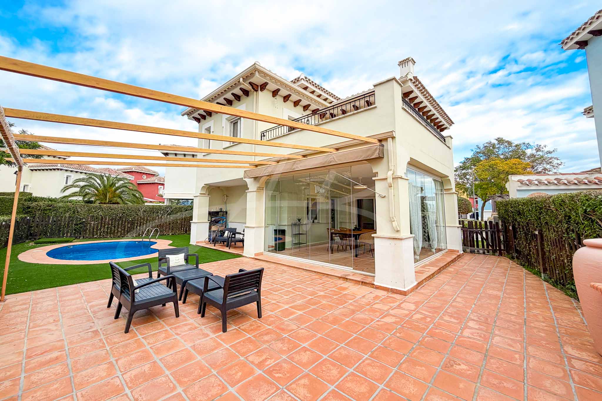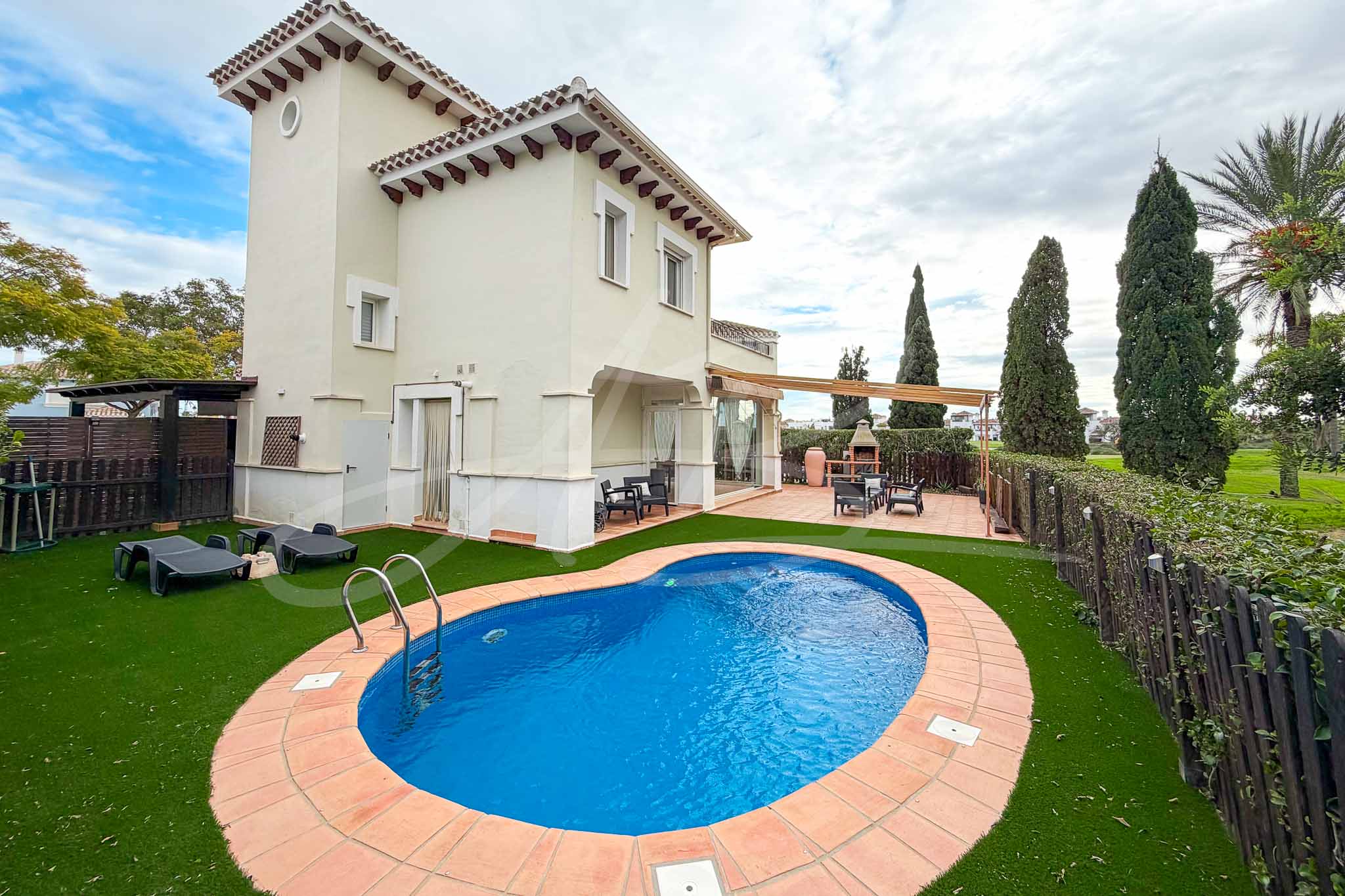 This fantastically positioned and beautifully presented southwest facing Baron Villa means sunshine is guaranteed for most of the day. Furthermore, it overlooks the sixth green of the Mar Menor golf course making for some lovely golf views from the property’s first floor. Being sold fully furnished and under exclusive instruction with ourselves, this stunning home is key ready and just waiting to be moved into. The present owner has chosen to fully open up downstairs to create a spacious open plan design which now incorporates a superb ‘glazed-in’ terrace to provide the property with an entire other room. A generously sized garden with wooden panelled fencing and mature hedging as an attractive backdrop, is home to the family sized swimming pool which sits within a large, spacious and sunny rear garden – part tiled and part astro-turfed for easy maintenance.