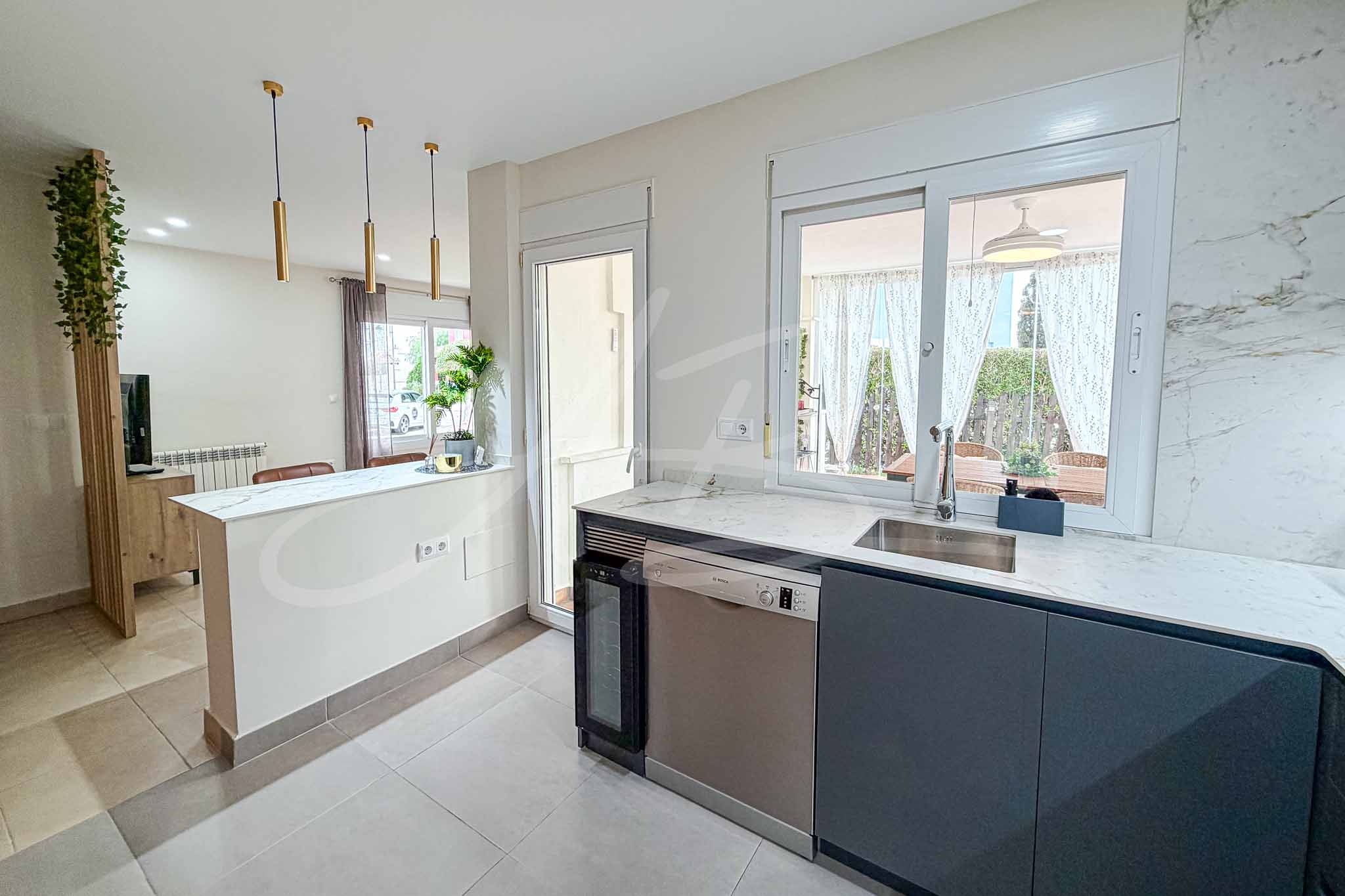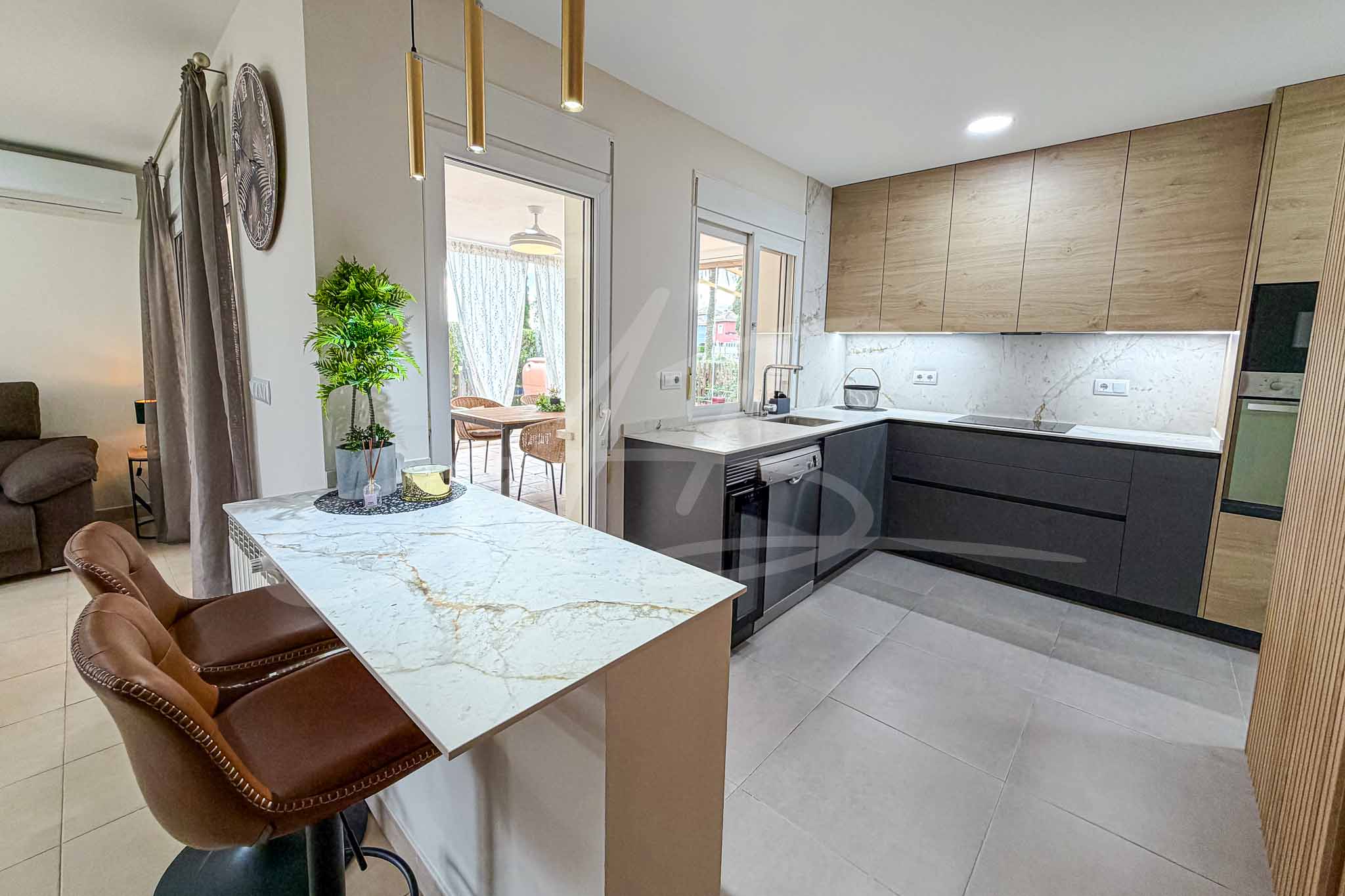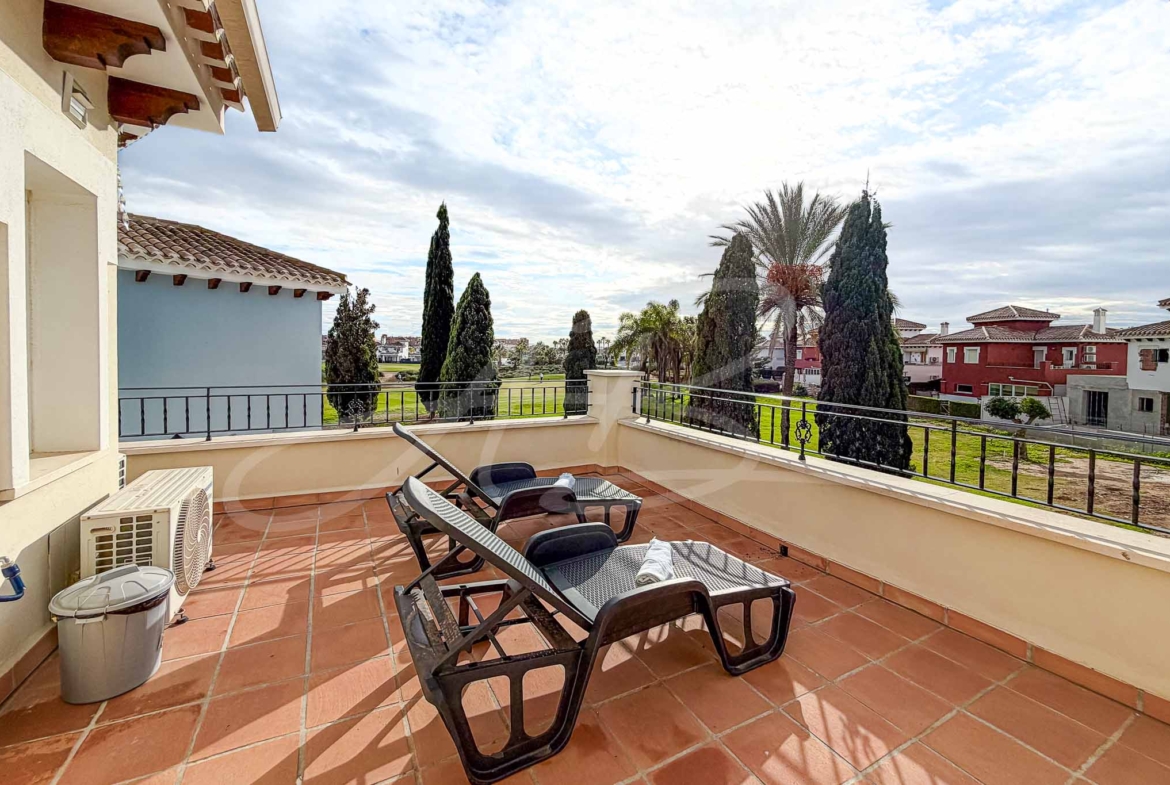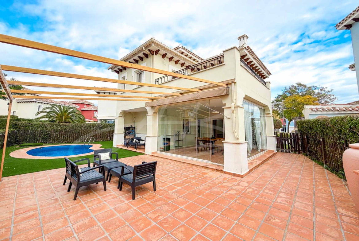 This fantastically positioned and beautifully presented southwest facing Baron Villa means sunshine is guaranteed for most of the day. Furthermore, it overlooks the sixth green of the Mar Menor golf course making for some lovely golf views from the property’s first floor. Being sold fully furnished and under exclusive instruction with ourselves, this stunning home is key ready and just waiting to be moved into. The present owner has chosen to fully open up downstairs to create a spacious open plan design which now incorporates a superb ‘glazed-in’ terrace to provide the property with an entire other room. A generously sized garden with wooden panelled fencing and mature hedging as an attractive backdrop, is home to the family sized swimming pool which sits within a large, spacious and sunny rear garden – part tiled and part astro-turfed for easy maintenance.