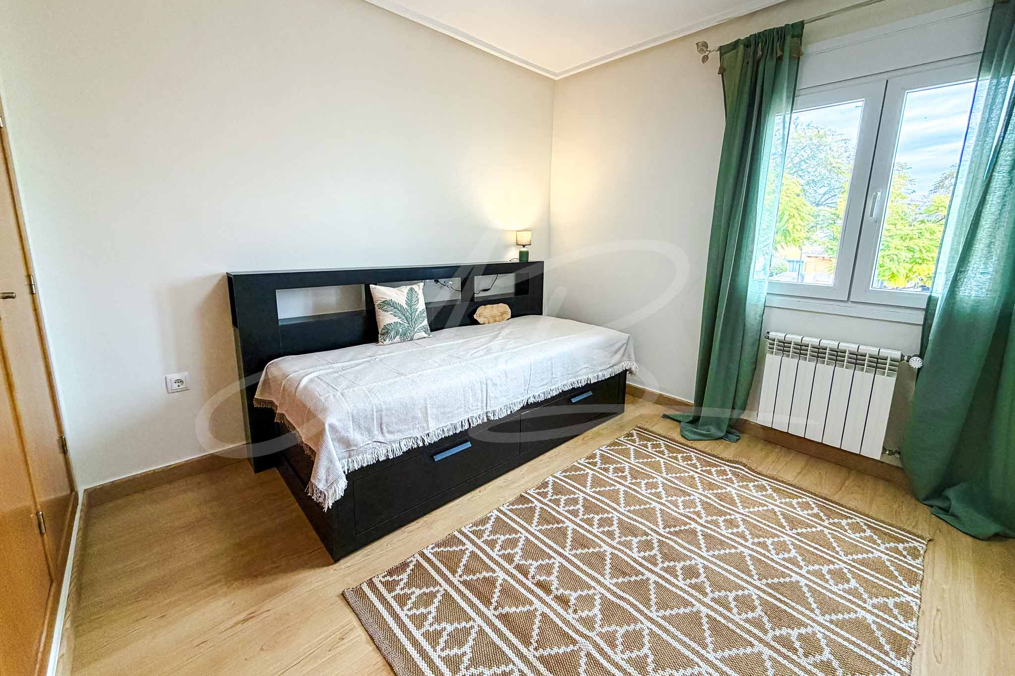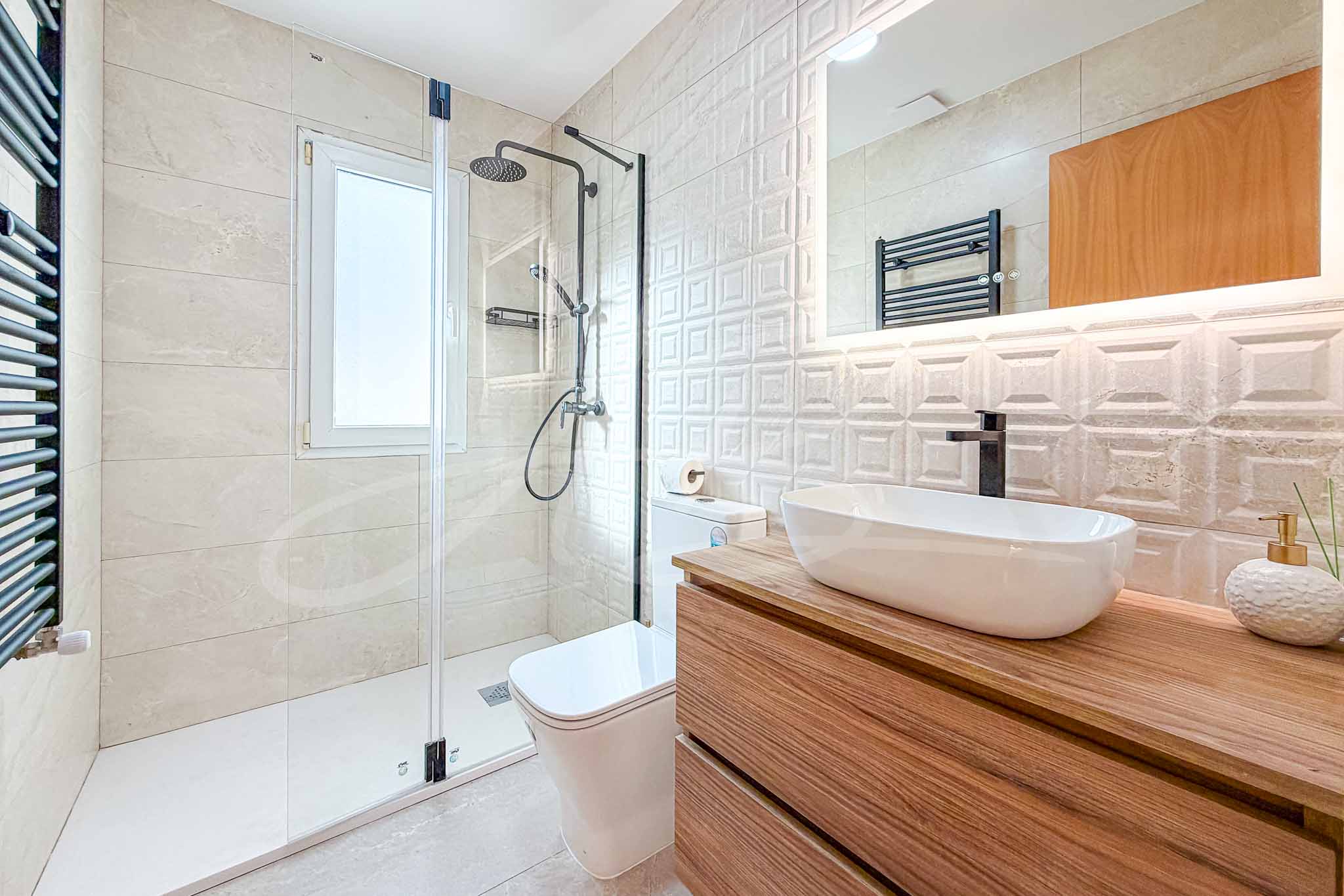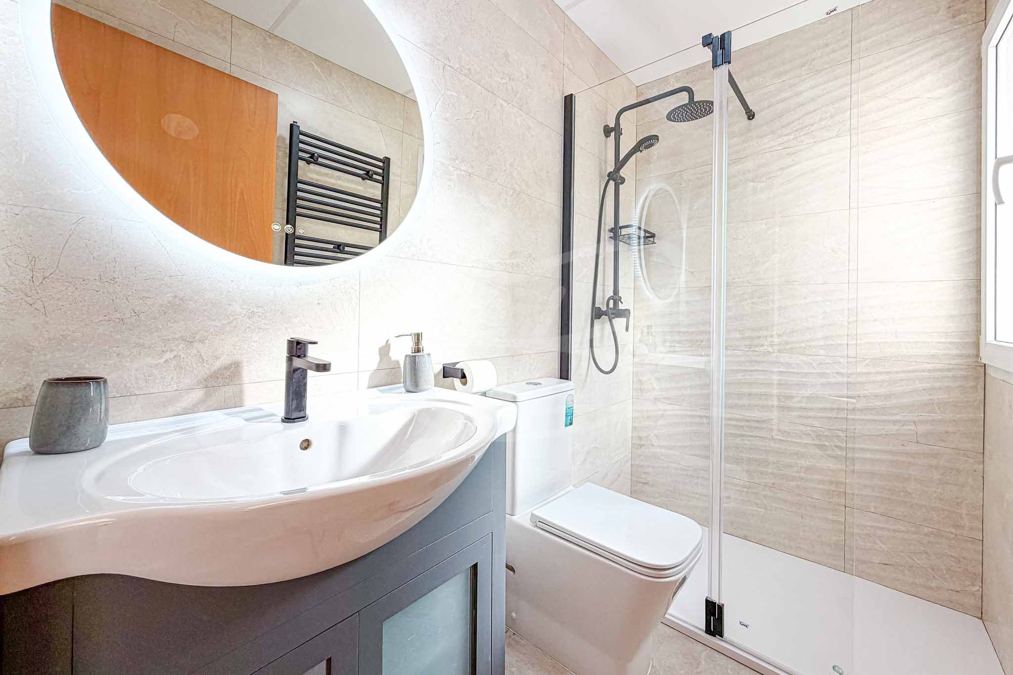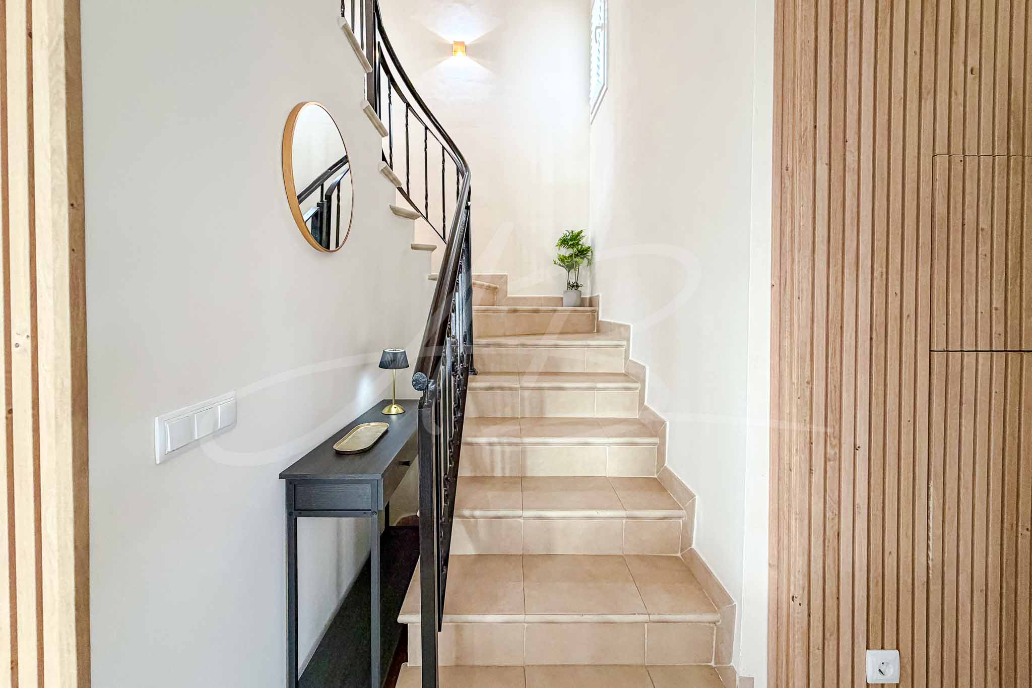 The villa’s main entrance opens up into the bright and welcoming living area, fully fitted kitchen, and a recently updated and very handy shower room located at the foot of the stairs. Sleek wooden wall panelling creates a modern twist, and the overall feel is an understated, sleek, almost Scandinavian style, home which really must be seen to be fully appreciated.