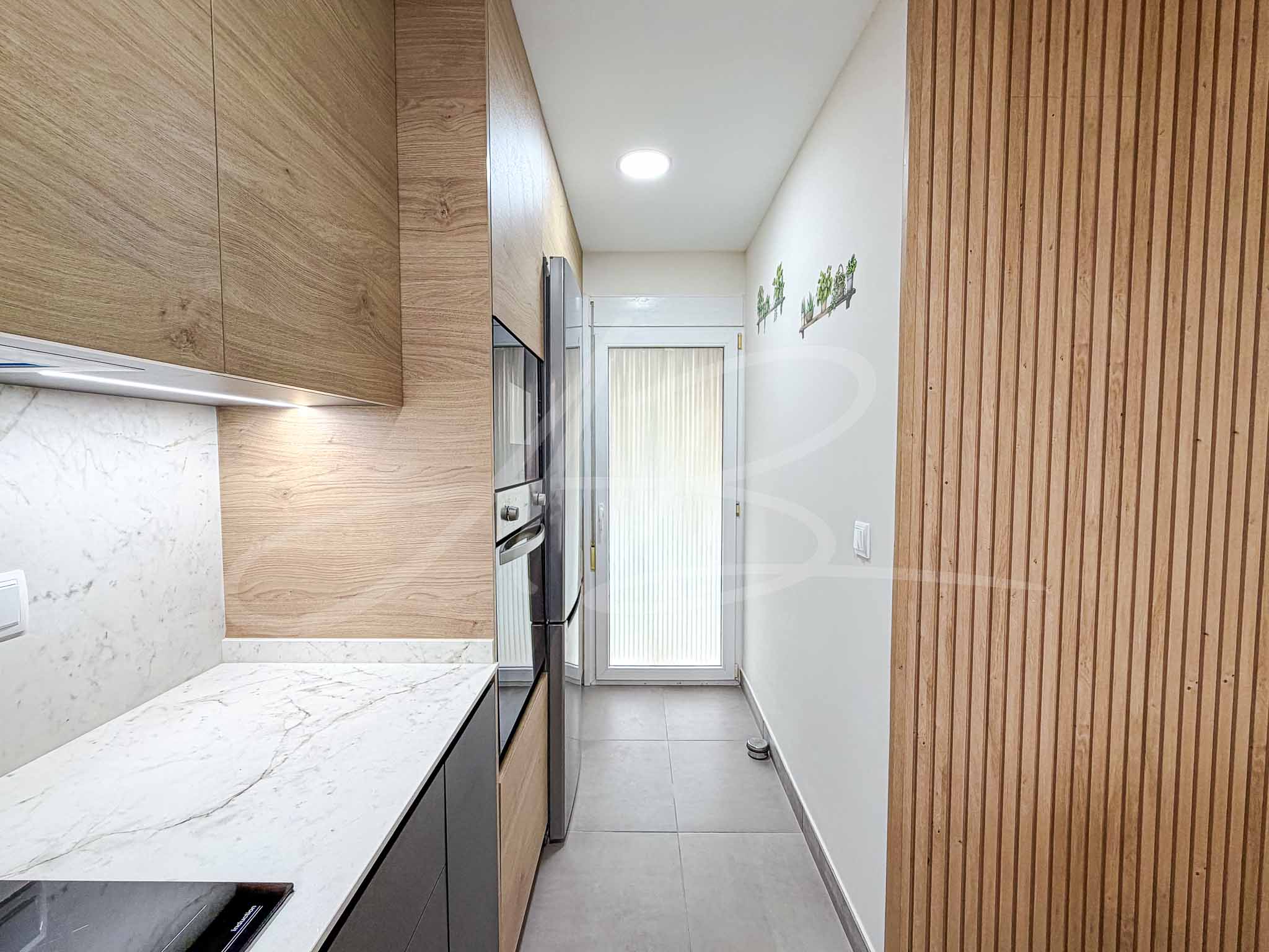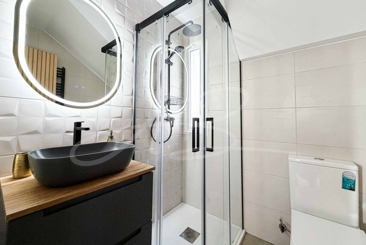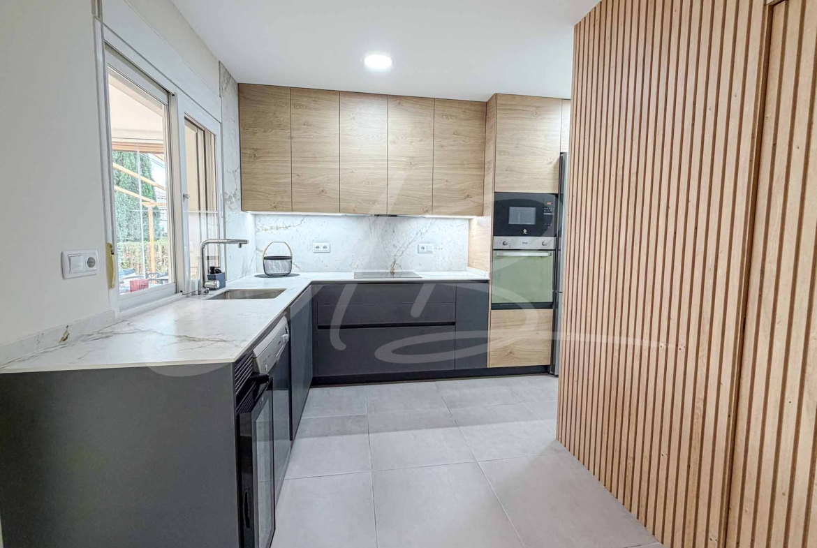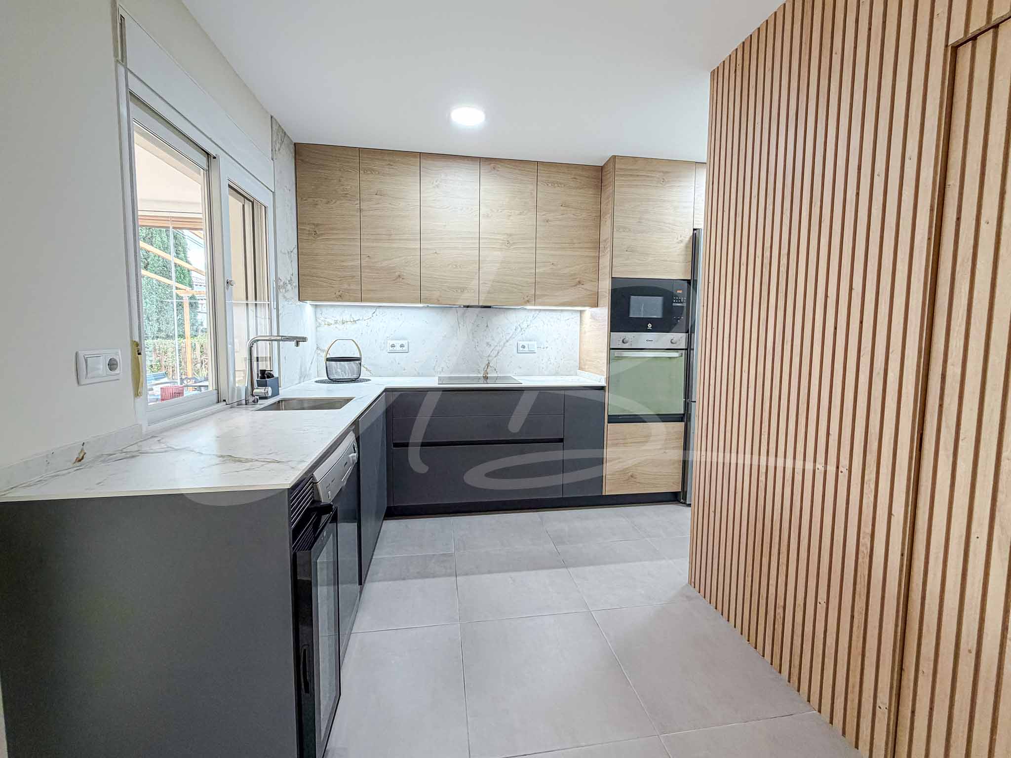 The villa’s main entrance opens up into the bright and welcoming living area, fully fitted kitchen, and a recently updated and very handy shower room located at the foot of the stairs. Sleek wooden wall panelling creates a modern twist, and the overall feel is an understated, sleek, almost Scandinavian style, home which really must be seen to be fully appreciated.