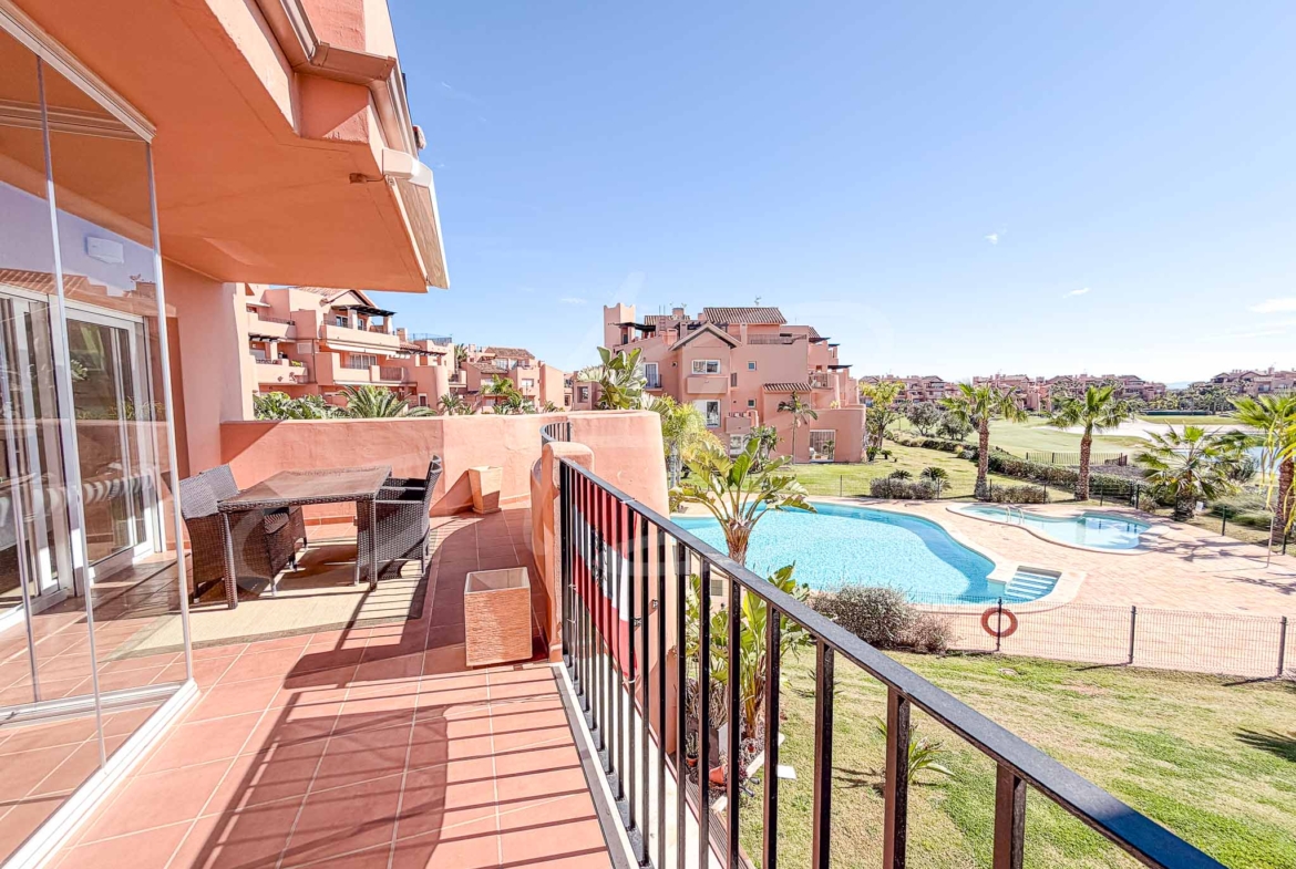 This elegantly appointed “Melvin” first-floor apartment offers a seamless blend of luxury and convenience, arriving on the market fully furnished. The standout feature is the expansive main terrace, accessible from both the living area and the master suite, which provides tranquil views over the communal swimming pool and lush, landscaped gardens. Its prime location ensures that the golf driving range, Clubhouse, and the premium facilities of the onsite five-star hotel are all reachable within a short, pleasant stroll.