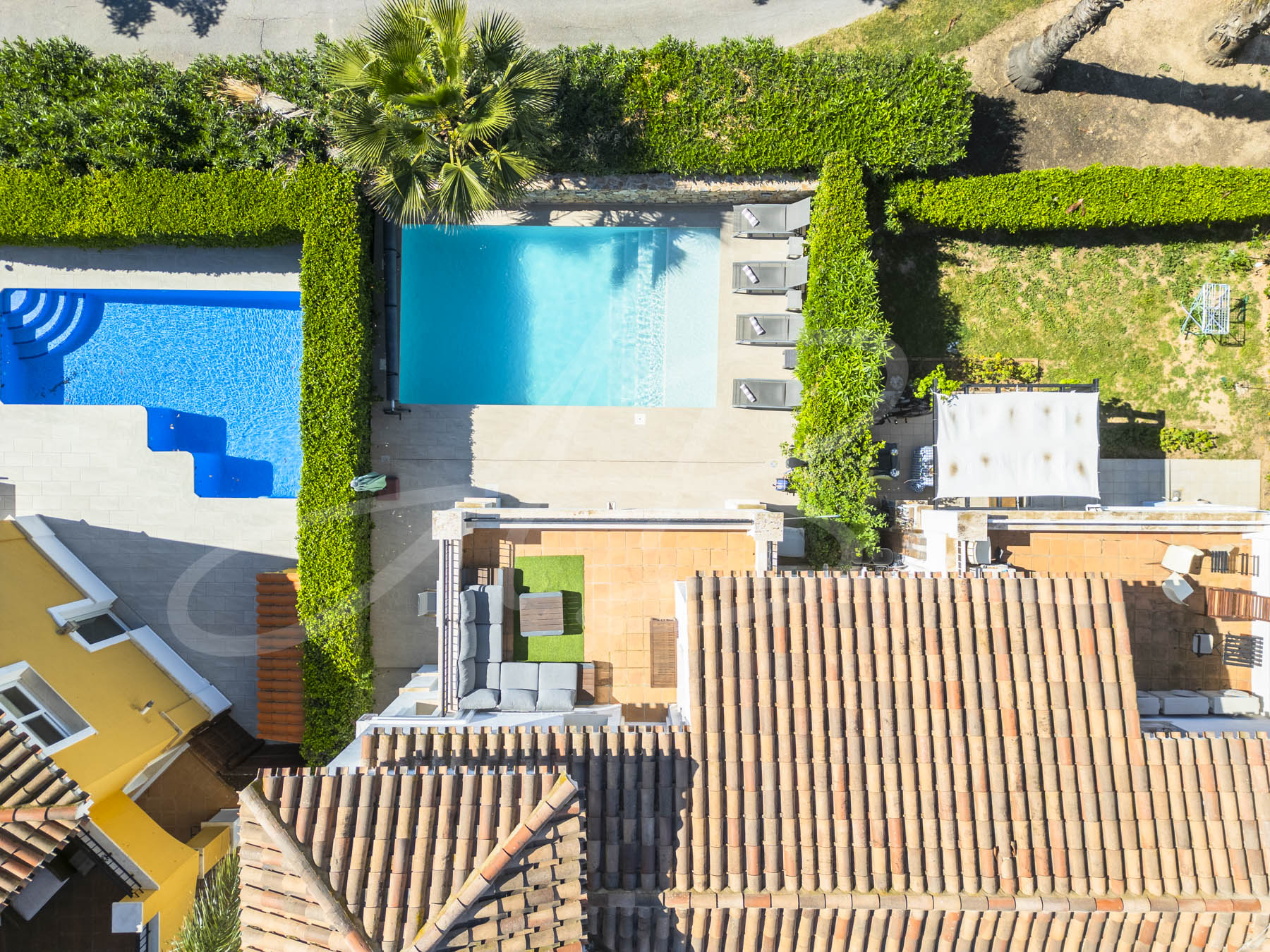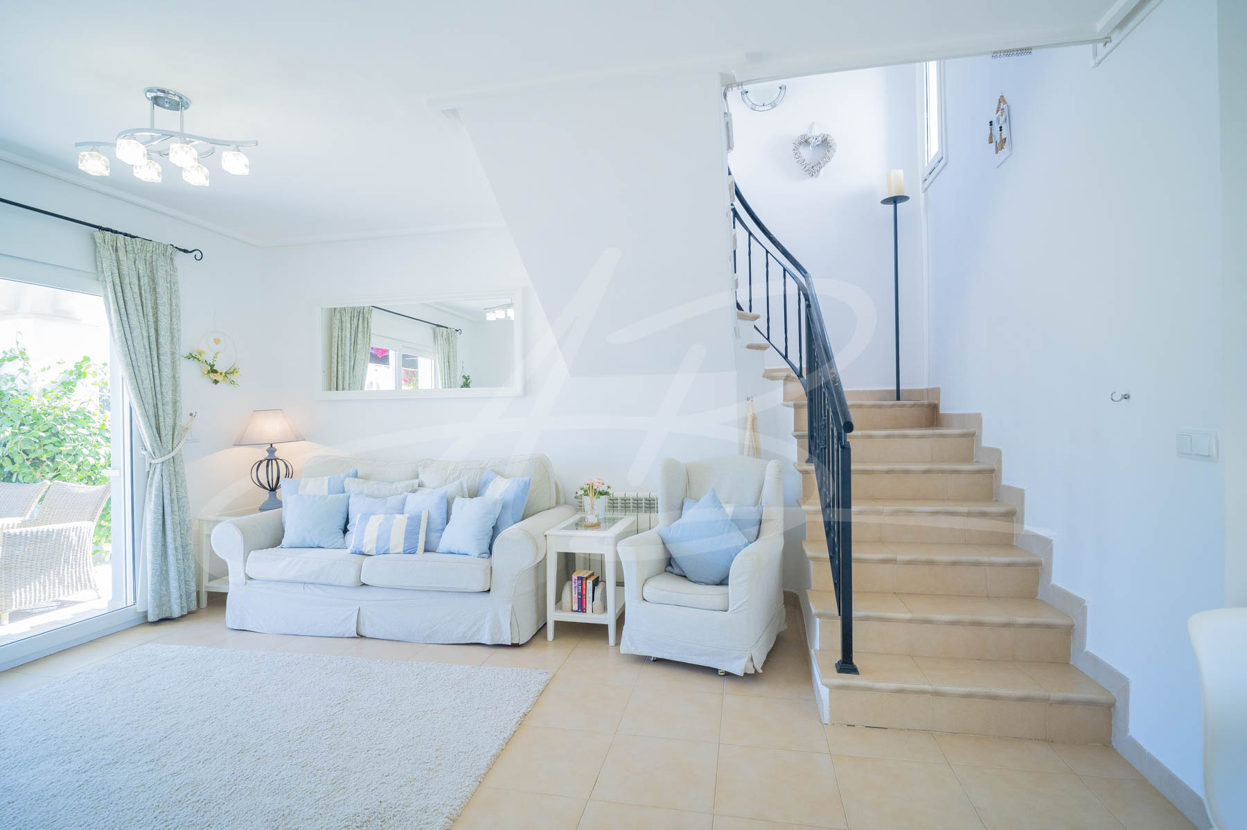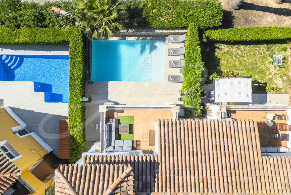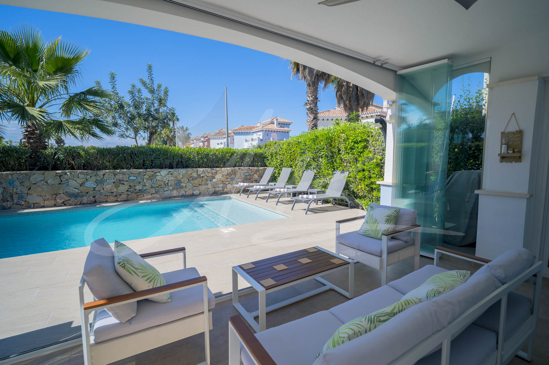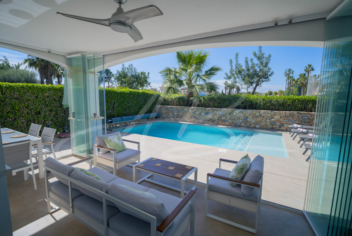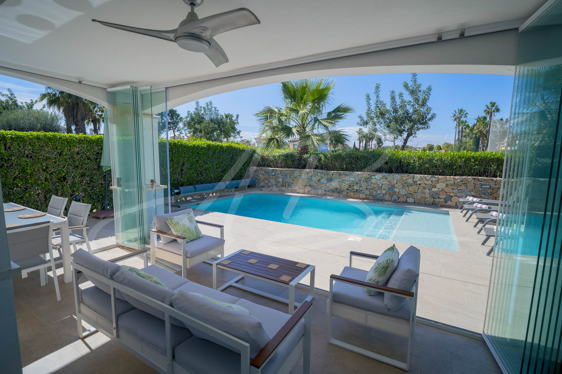 Hugely bright and welcoming on entry, the downstairs of this property features a fully air-conditioned open plan living/dining room with a galley style kitchen complete with high top bar and an adjacent utility room. Full height patio doors provide access out onto both the front and rear terraces; the rear terrace being a former covered area, now transformed into a sensational garden room fitted with highly stylish floor to ceiling glass curtains. Access from here takes you into its fully updated garden with a brand new, family sized swimming pool, within its tiled terracing, as its focal point. There is plenty of surrounding space for barbecuing, relaxation and dining al-fresco. There is even an abundance of storage space provided by a discreet under-build.