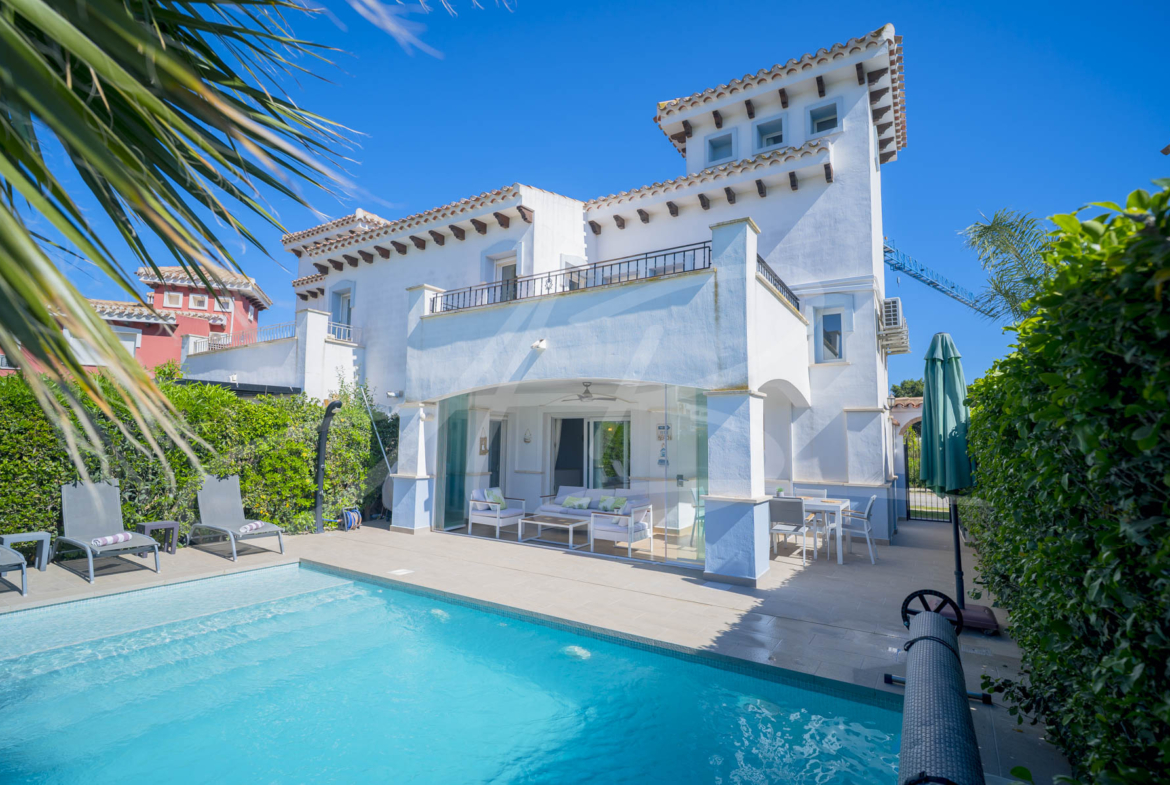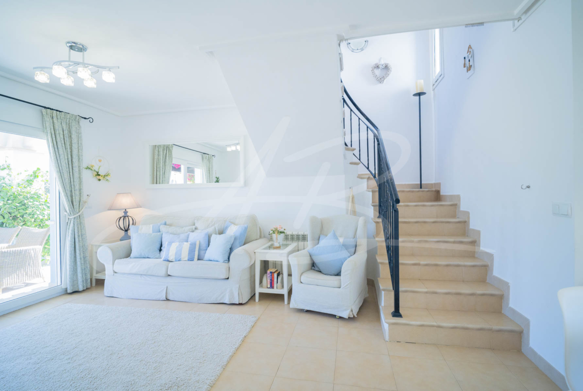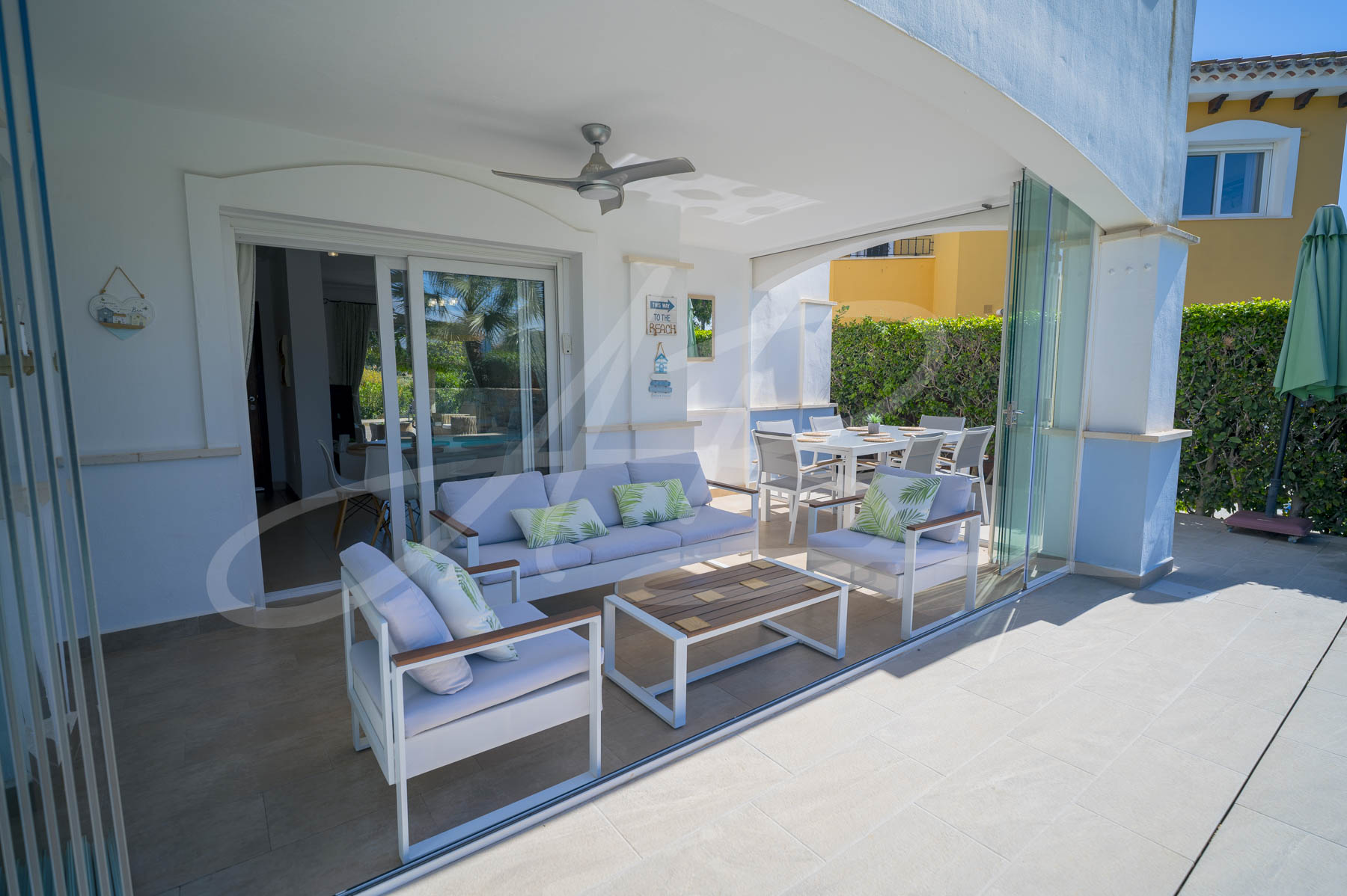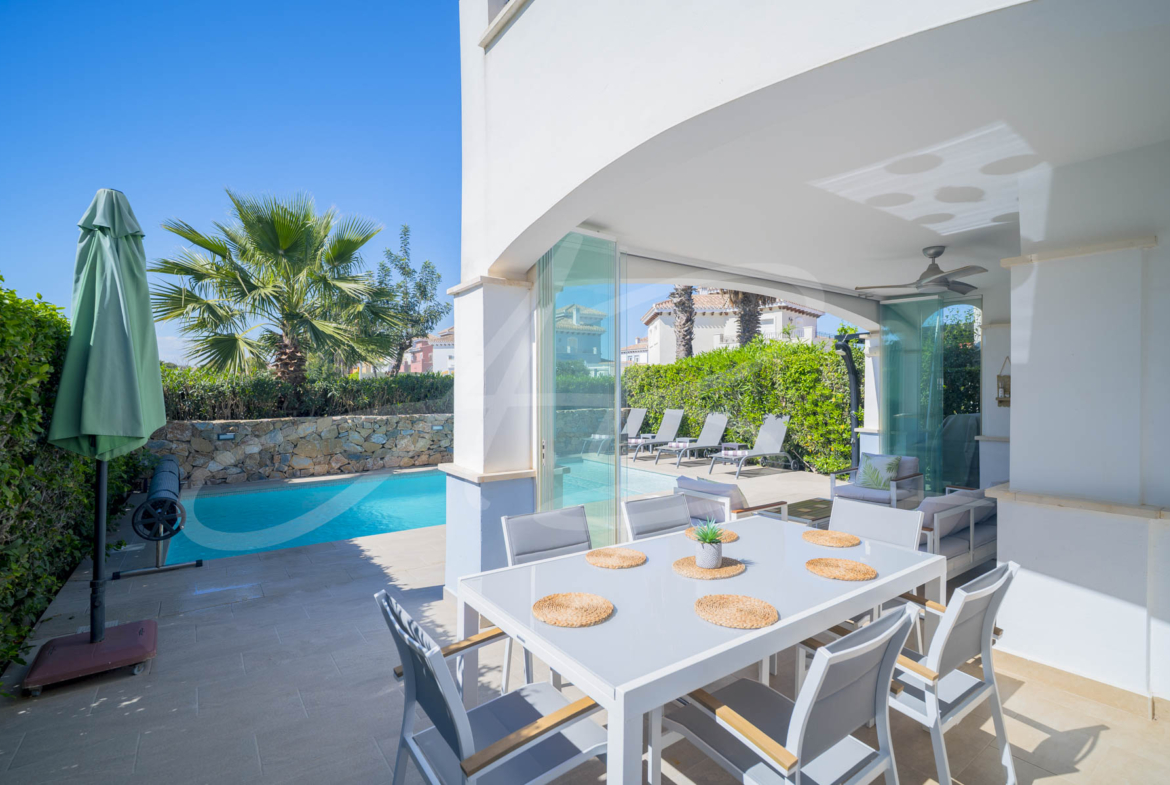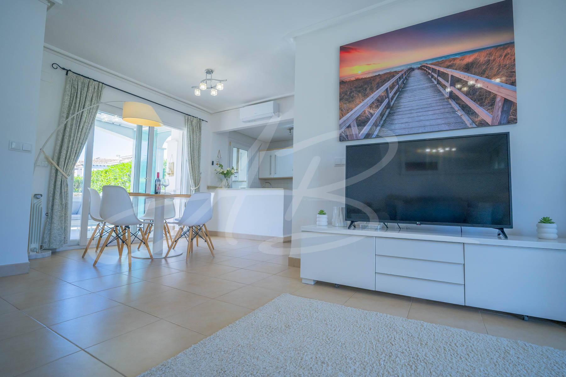 Hugely bright and welcoming on entry, the downstairs of this property features a fully air-conditioned open plan living/dining room with a galley style kitchen complete with high top bar and an adjacent utility room. Full height patio doors provide access out onto both the front and rear terraces; the rear terrace being a former covered area, now transformed into a sensational garden room fitted with highly stylish floor to ceiling glass curtains. Access from here takes you into its fully updated garden with a brand new, family sized swimming pool, within its tiled terracing, as its focal point. There is plenty of surrounding space for barbecuing, relaxation and dining al-fresco. There is even an abundance of storage space provided by a discreet under-build.