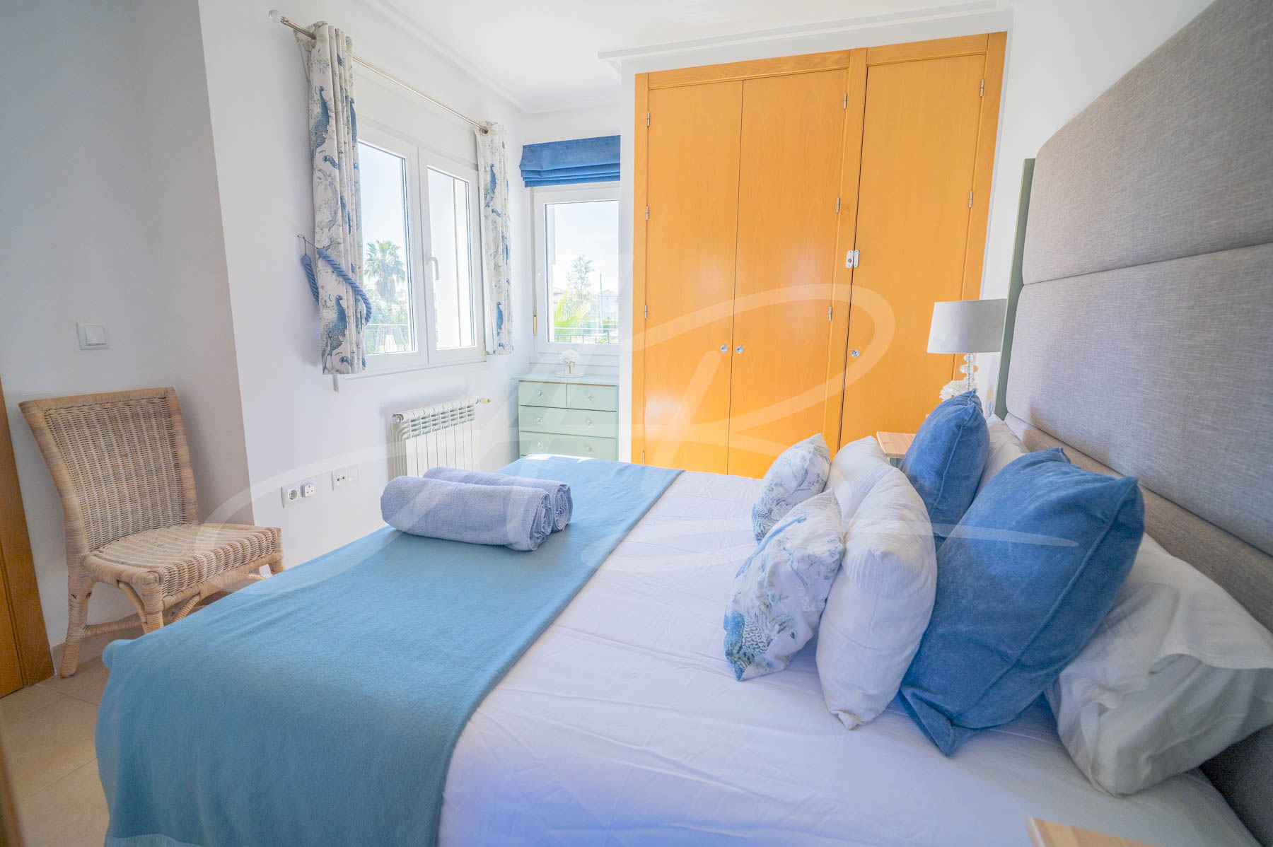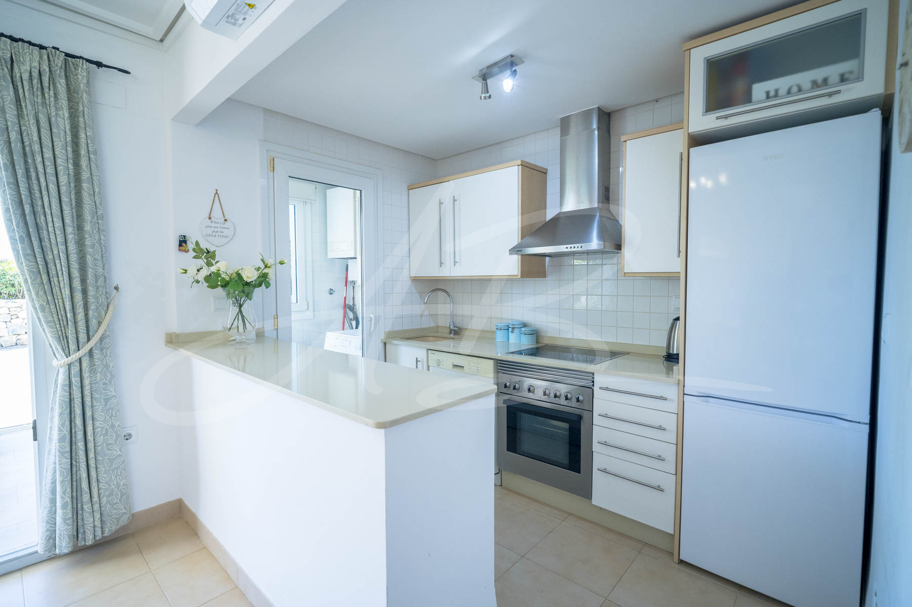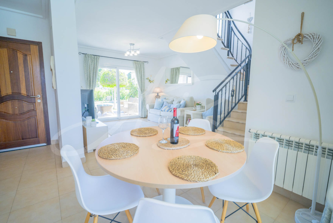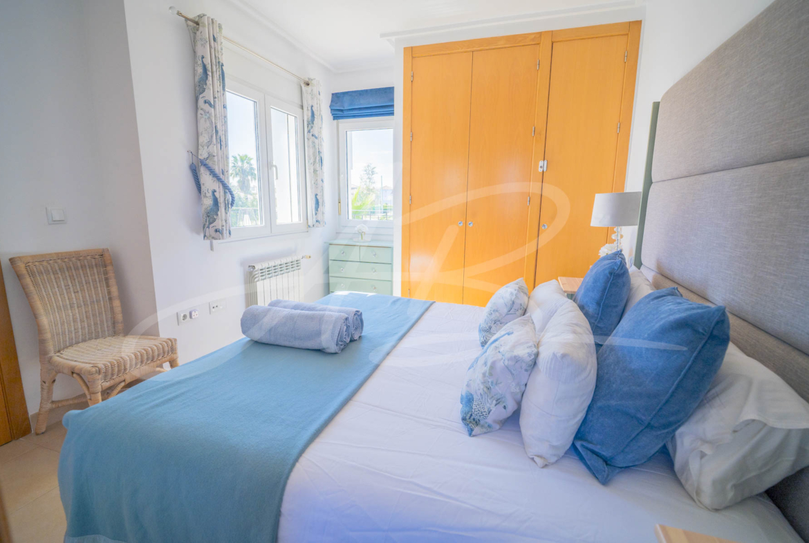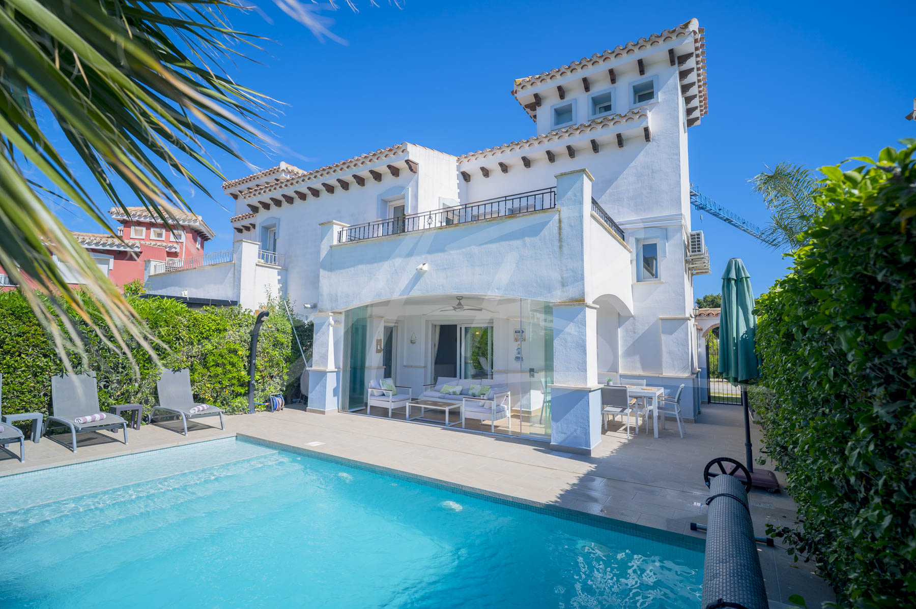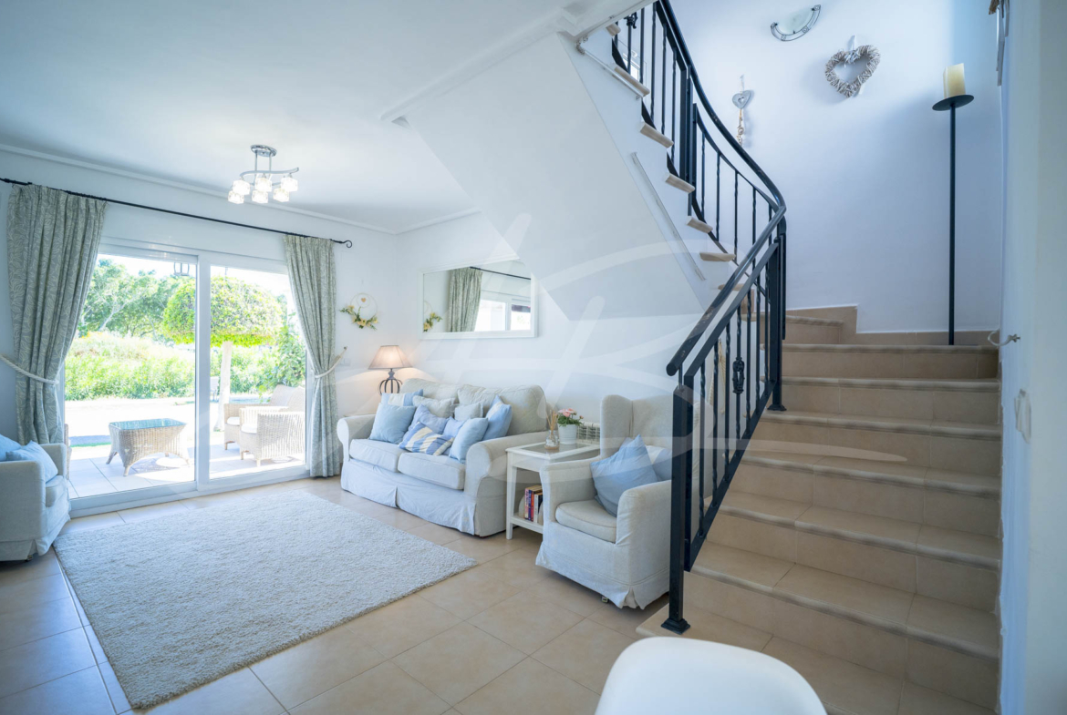 Hugely bright and welcoming on entry, the downstairs of this property features a fully air-conditioned open plan living/dining room with a galley style kitchen complete with high top bar and an adjacent utility room. Full height patio doors provide access out onto both the front and rear terraces; the rear terrace being a former covered area, now transformed into a sensational garden room fitted with highly stylish floor to ceiling glass curtains. Access from here takes you into its fully updated garden with a brand new, family sized swimming pool, within its tiled terracing, as its focal point. There is plenty of surrounding space for barbecuing, relaxation and dining al-fresco. There is even an abundance of storage space provided by a discreet under-build.