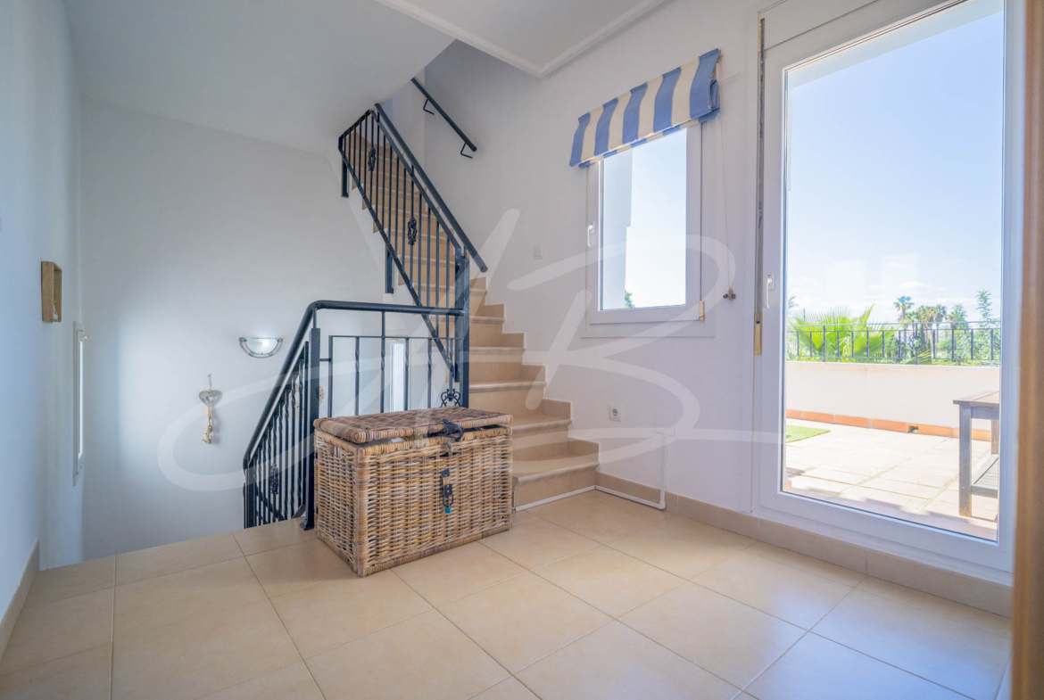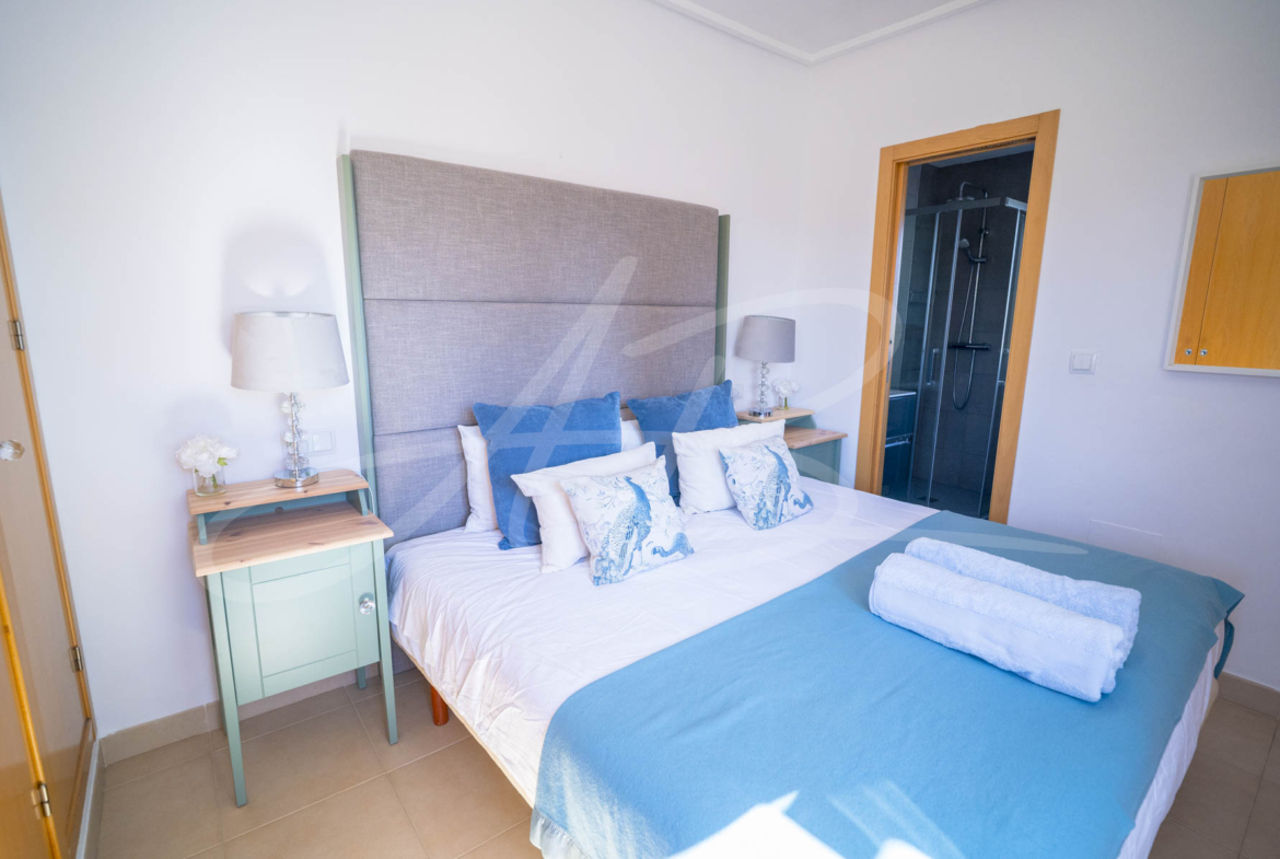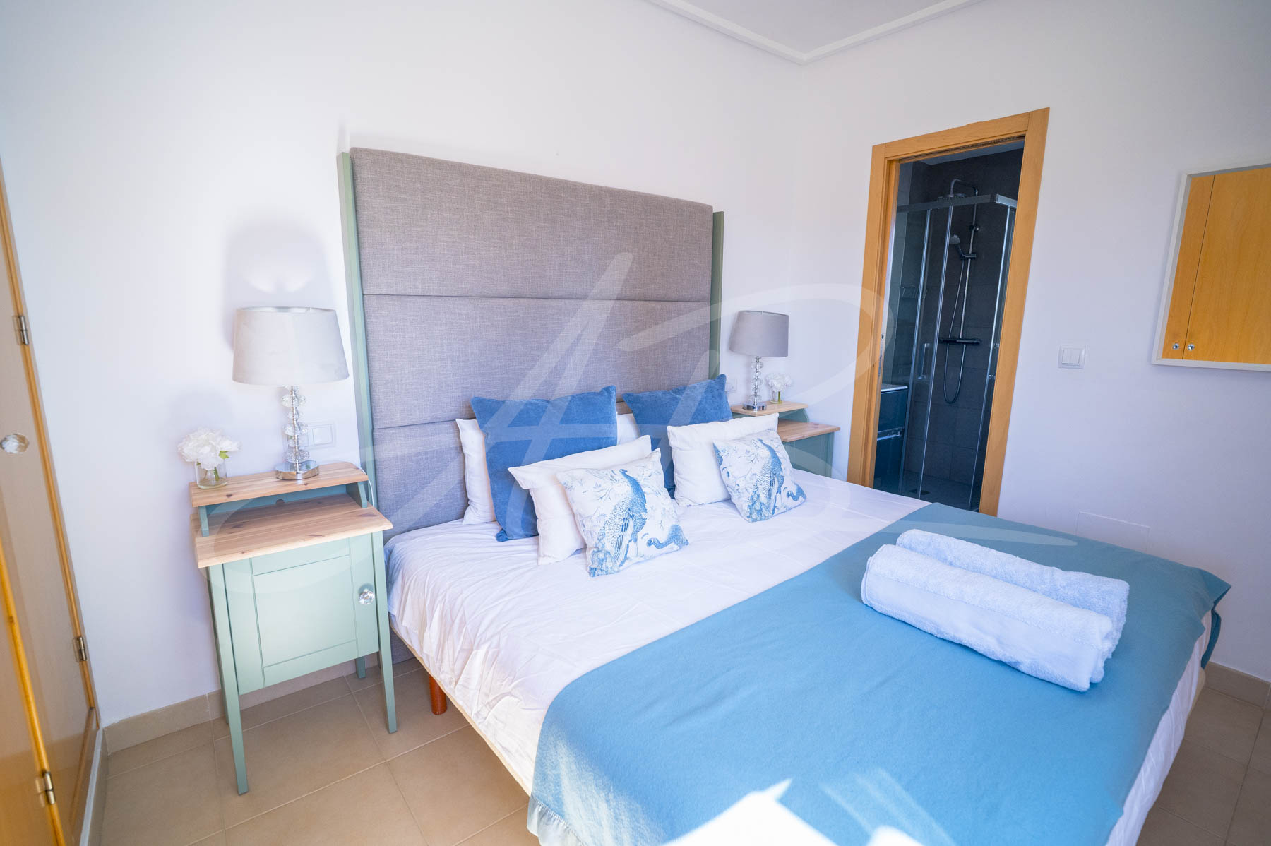 Stairs take you up to the first floor which is home to the property’s two main double bedrooms – each having the luxury of their own shower rooms; the master of which is en-suite, the guest bedroom being located immediately adjacent. Both rooms are fitted with full height wardrobes offering plenty of hanging and storage space. The landing area provides access out onto a large first floor terrace which enjoys views over both the rear garden and pool, and out over the stunning second hole and fairway of the Mar Menor Golf Course.