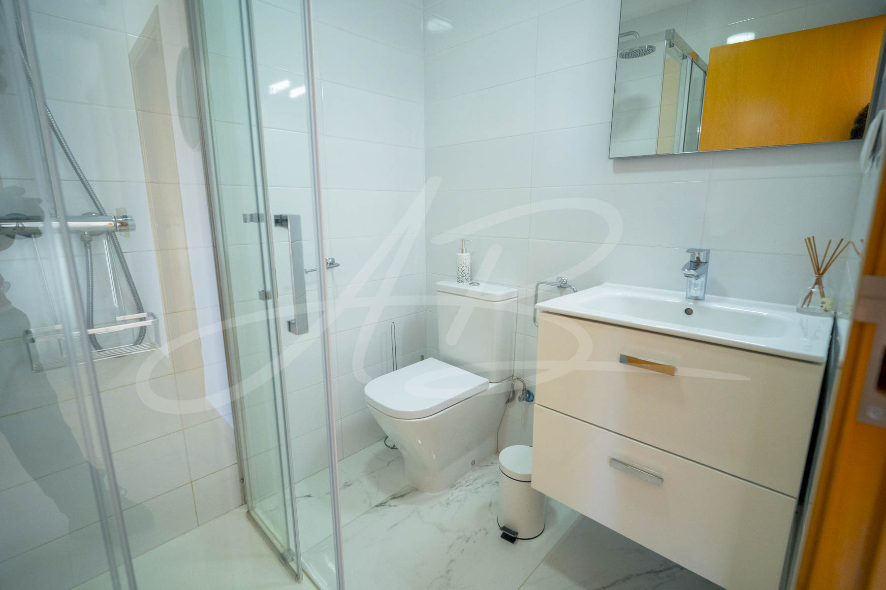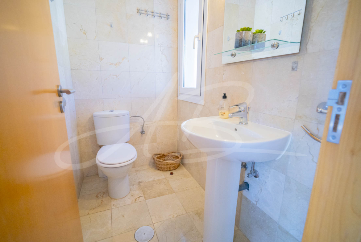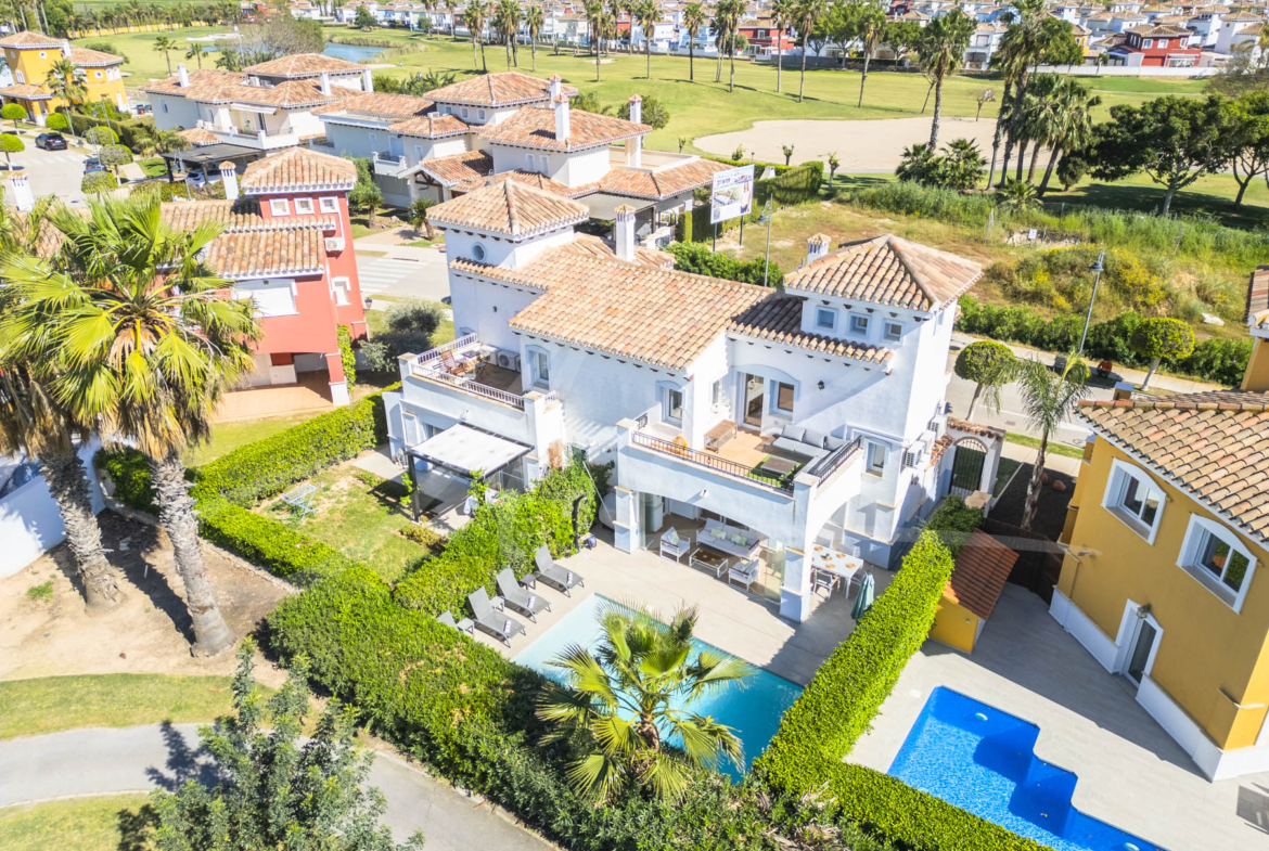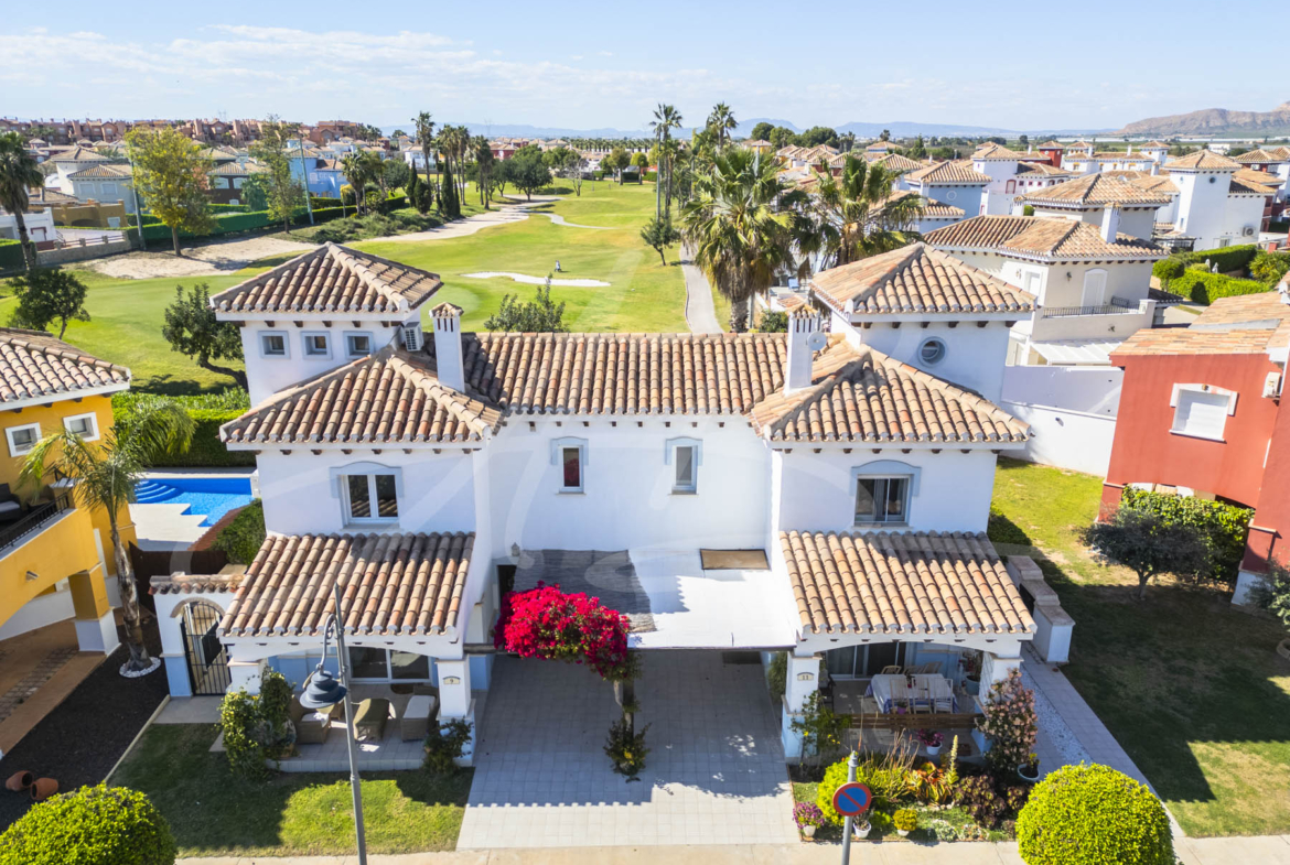 Stairs take you up to the first floor which is home to the property’s two main double bedrooms – each having the luxury of their own shower rooms; the master of which is en-suite, the guest bedroom being located immediately adjacent. Both rooms are fitted with full height wardrobes offering plenty of hanging and storage space. The landing area provides access out onto a large first floor terrace which enjoys views over both the rear garden and pool, and out over the stunning second hole and fairway of the Mar Menor Golf Course.