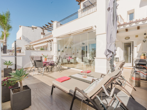This stunning three bedroom, two and a half bathroom Baron villa is located on a superb plot of the Mar Menor Golf Resort and is especially private. With a stunning fountain area towards the front of the property, the small cul-de-sac road is as peaceful and as tranquil as is possible. In the large and spacious tiled rear garden sits a family sized swimming pool, with plenty of space around it for relaxation, entertaining family and friends, or simply sitting back with a drink in hand and enjoying the surroundings. Sound sublime… come and take a look for yourself.